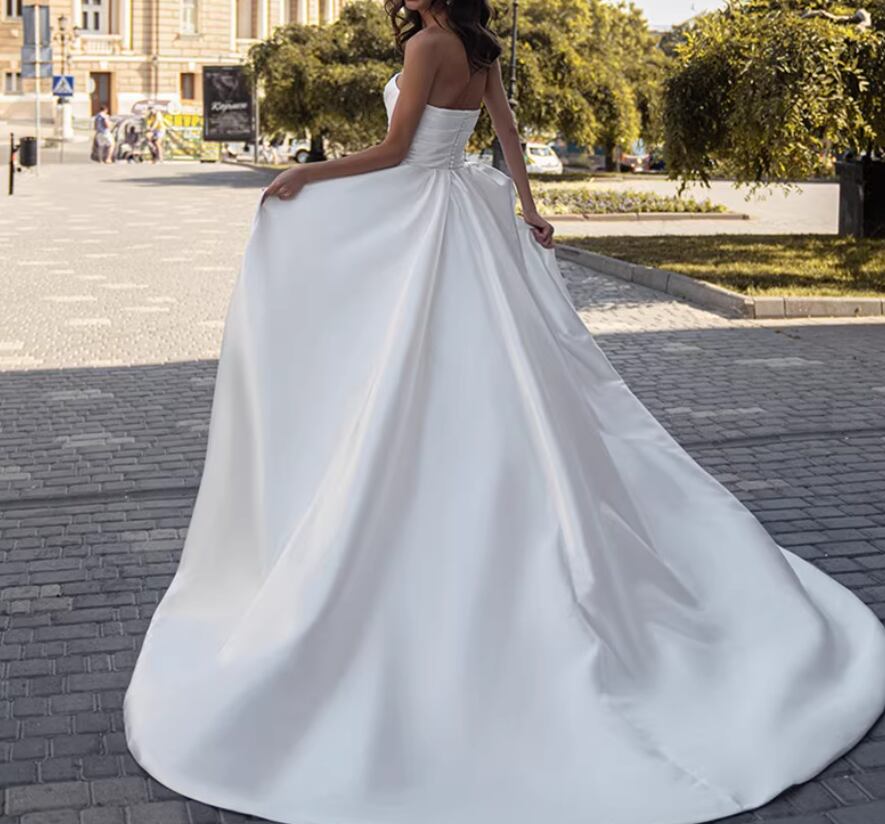 フランス風 ウエディングドレス ベアトップ ロイヤルサテン くるみボタン ミニトレーン 結婚式
