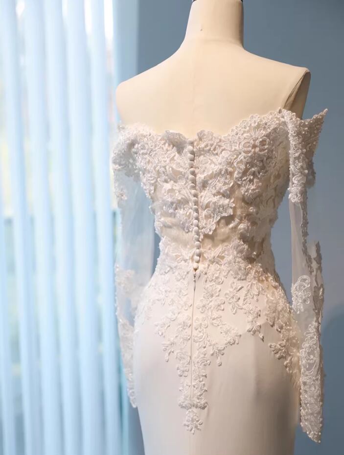 フランス風 ウエディングドレス オフショルダー エレガントレース シースルー袖 マーメイドライン 結婚式