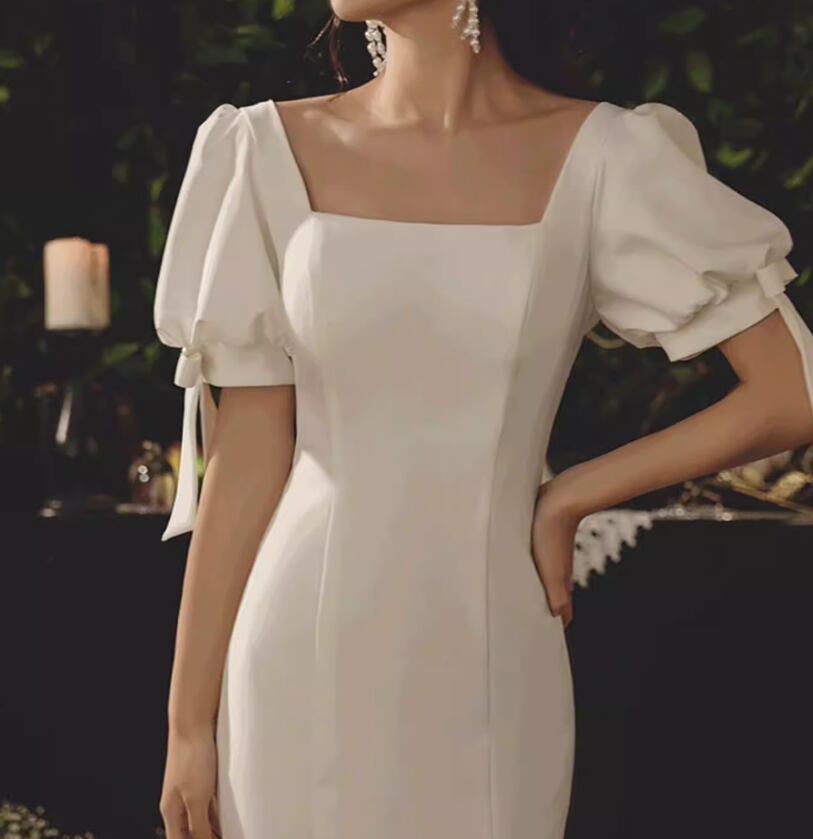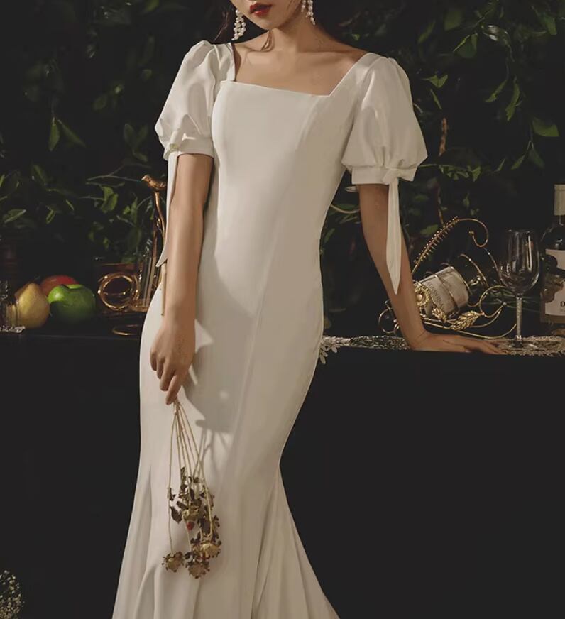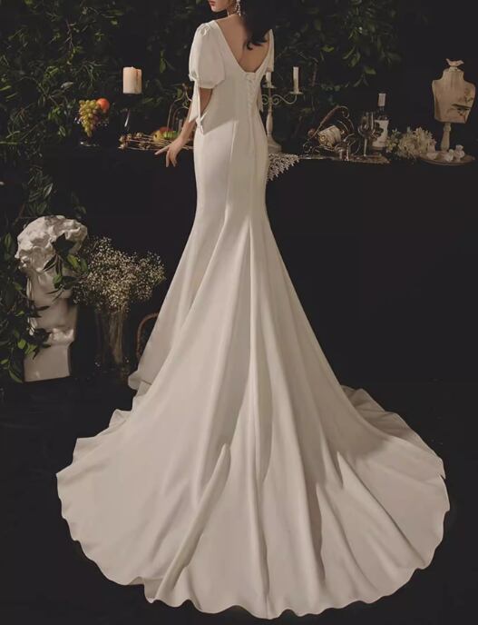 上品!ウェディングドレス スクエアネック パフスリーブ マーメイドライン 背中見せ 大人っぽい 拳式