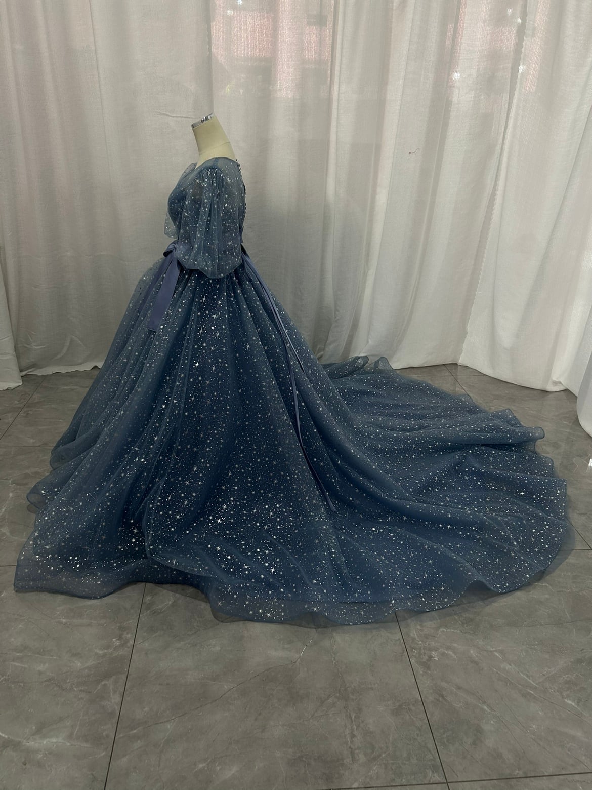 豪華!カラードレス+トップス ブルー キラキラグリッターチュール ロングトレーン 編み上げ 披露宴