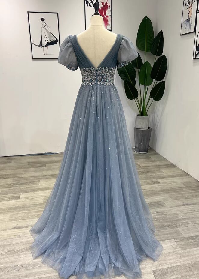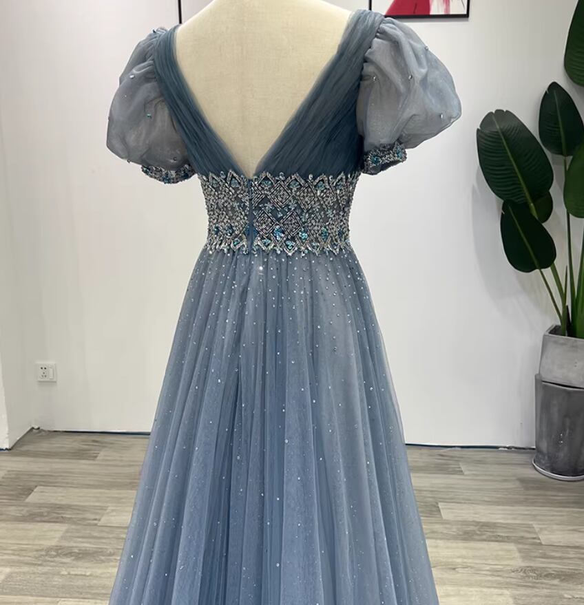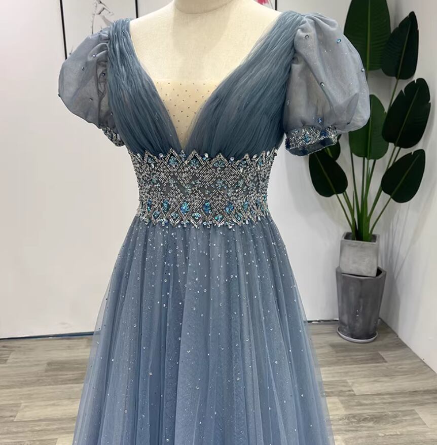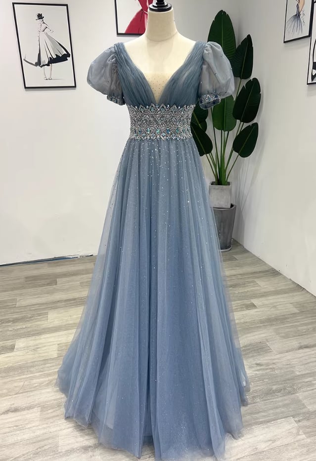上品!カラードレス Vネック カラーストーン パフスリーブ Aライン キラキラチュール 披露宴