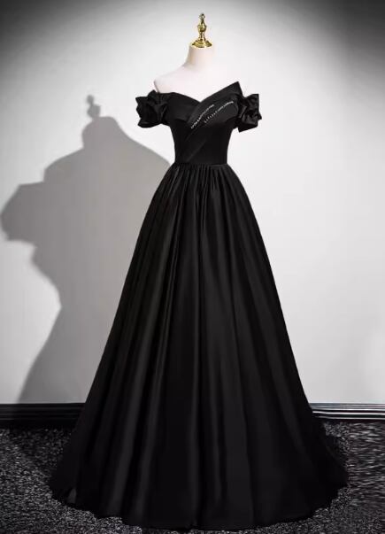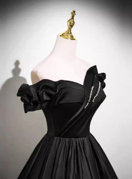 パーティードレス ブラック オフショルダー ビジュー フリル袖 光沢サテン Aライン 編み上げ 演奏会