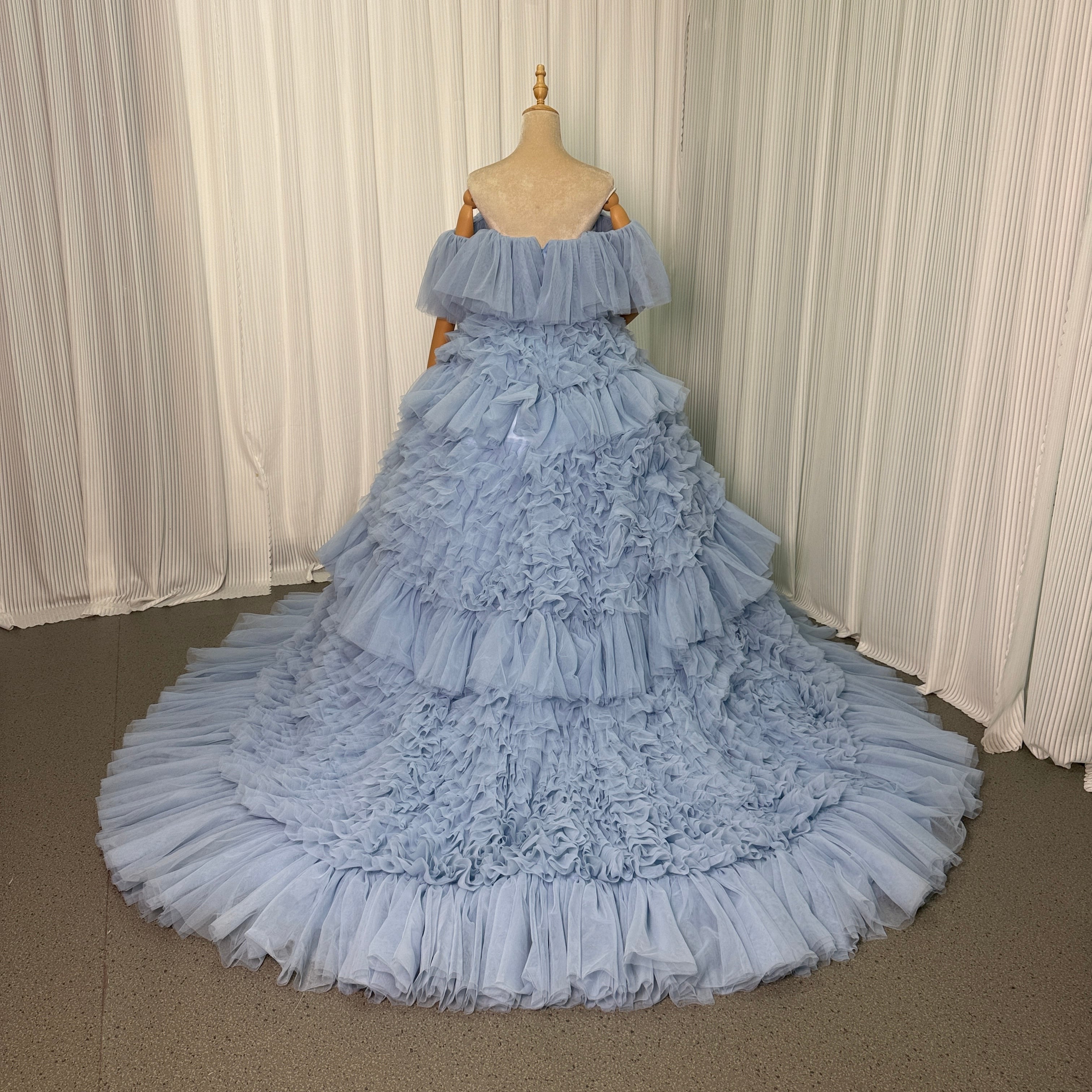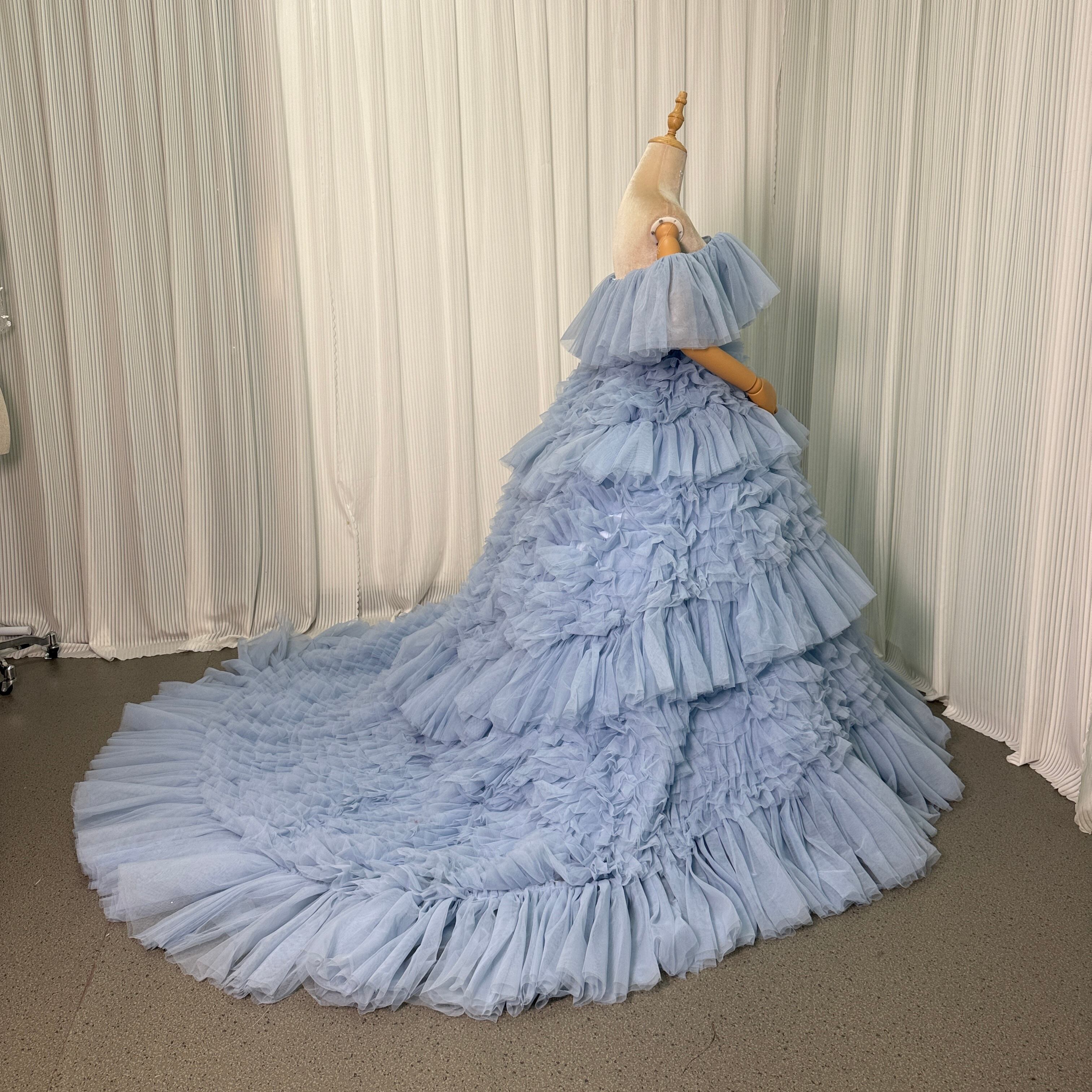 人気上昇!カラードレス ブルー オフショルダー 柔らかく重ねたチュールスカート ロングトレーン 花嫁