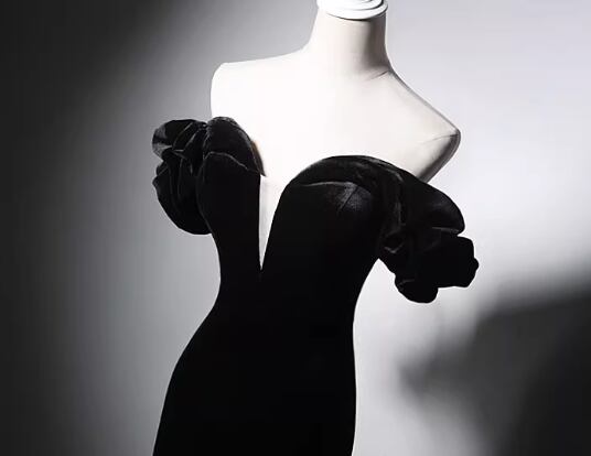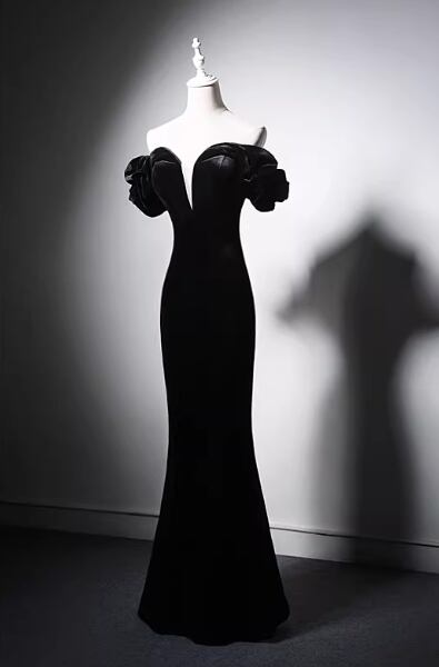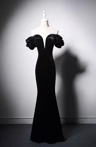 パーティードレス ブラック オフショルダー フリル袖 ビロード マーメイドライン ロング 披露宴