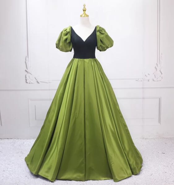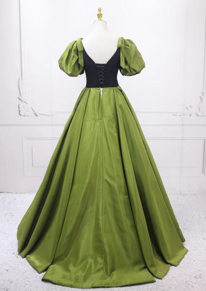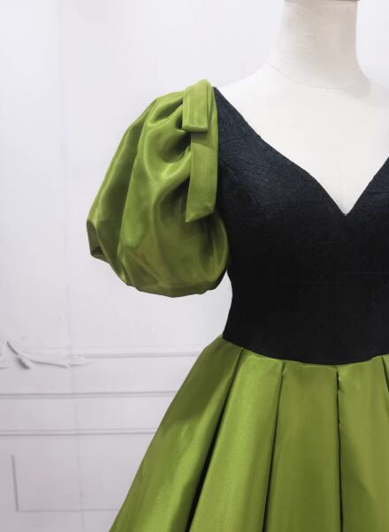 カラードレス グリーン Vネック リボン パフスリーブ Aライン ミニトレーン 編み上げ 披露宴