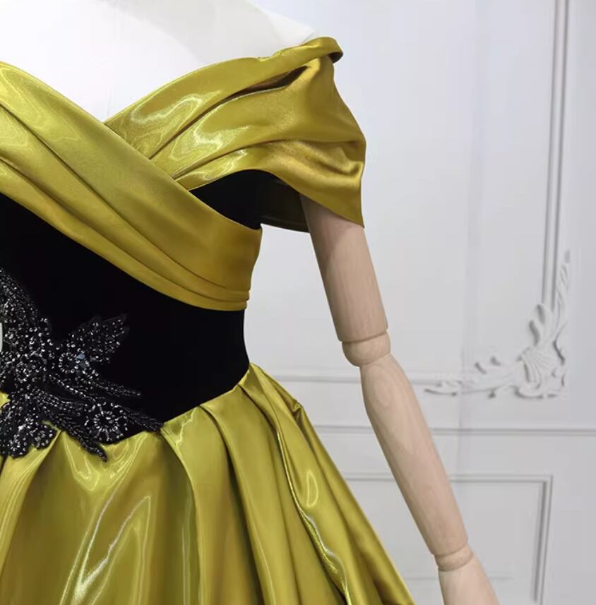 カラードレス グリーン オフショルダー キラキラ光る刺繍 フレアスカート 光沢サテン 編み上げ 披露宴