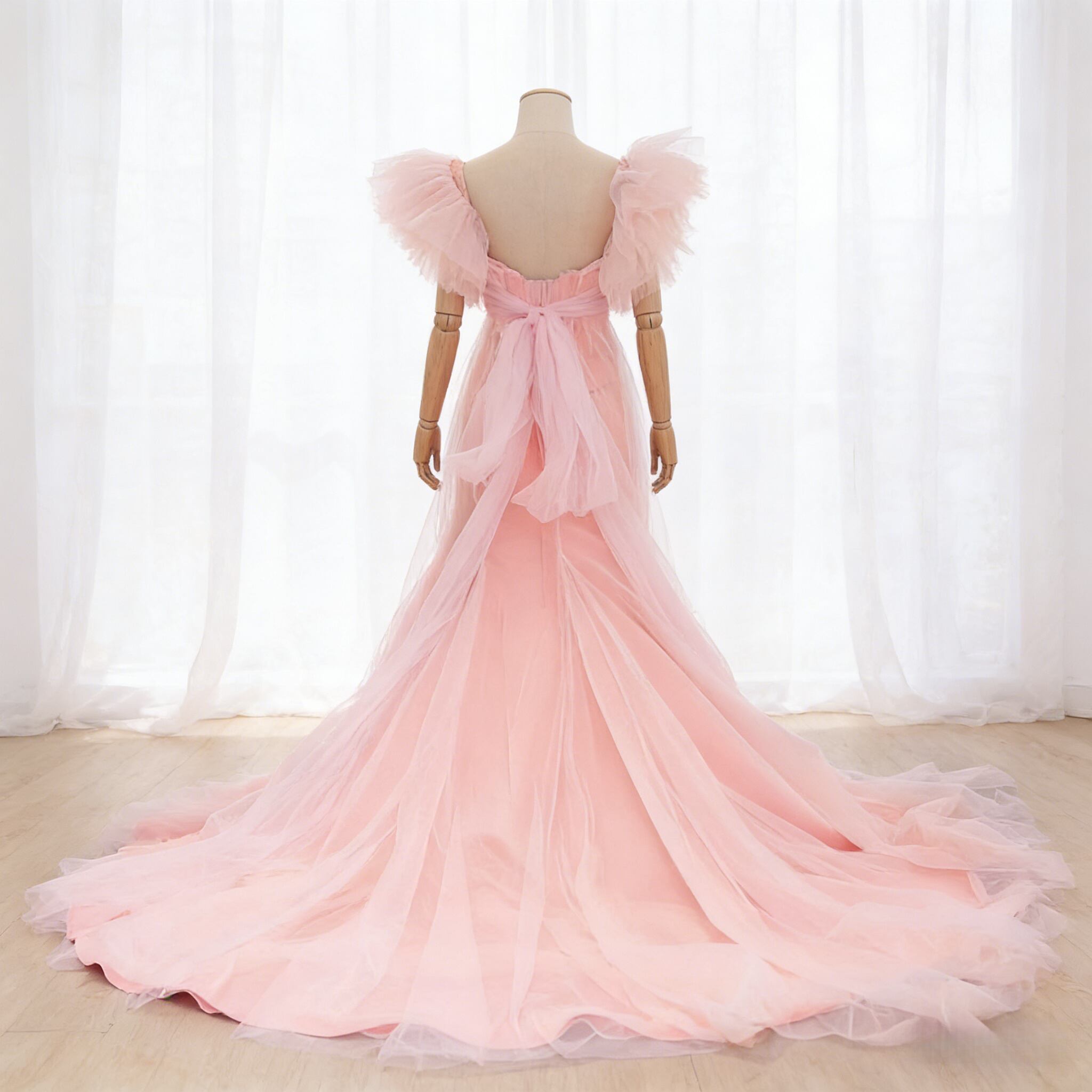 フランス風 カラードレス ピンク フレア袖 優雅なシルエット チュールスカート 背中見せ 可愛い 前撮り