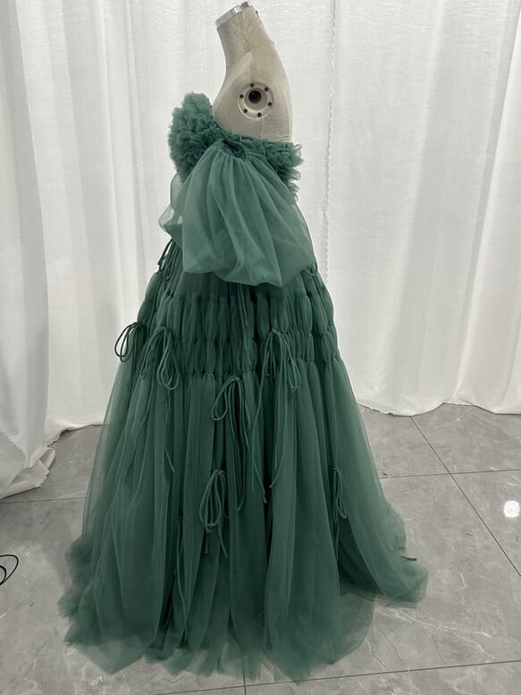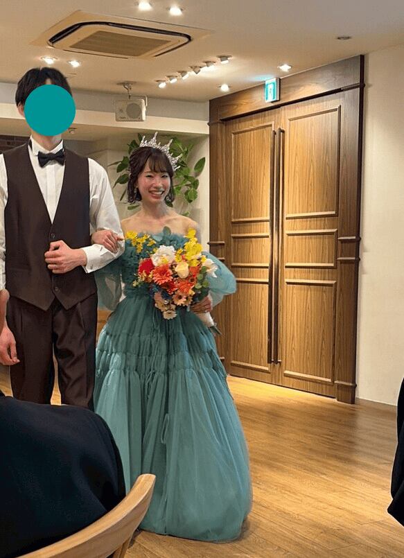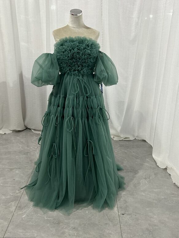 実例写真!カラードレス ミントグリーン ベアトップ 取り外し袖 ロング ラッフルフリル リボン 花嫁