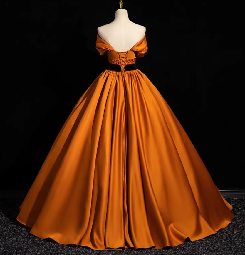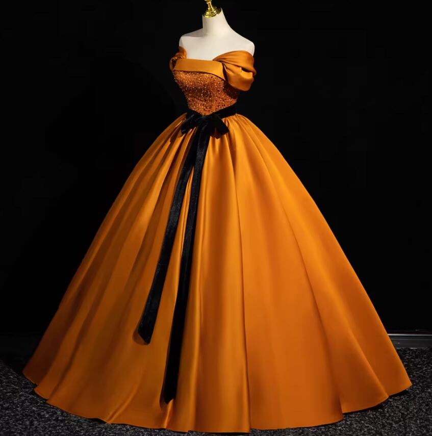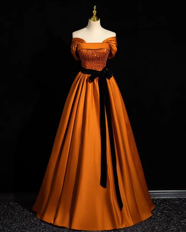 カラードレス オレンジ オフショルダー シークインチュール フレアスカート 光沢サテン 編み上げ 披露宴