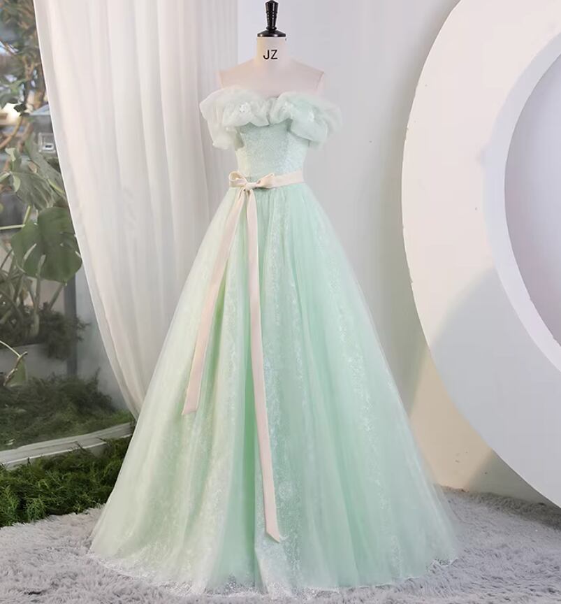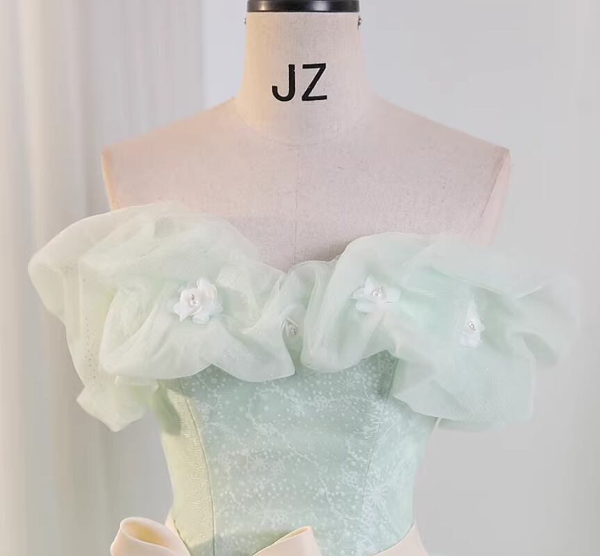 カラードレス ライトグリーン オフショルダー 花モチーフ キラキラチュール プリンセスライン 花嫁