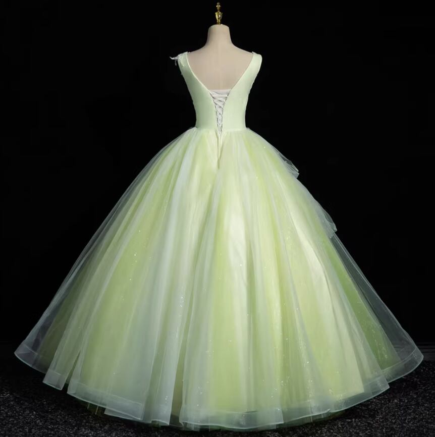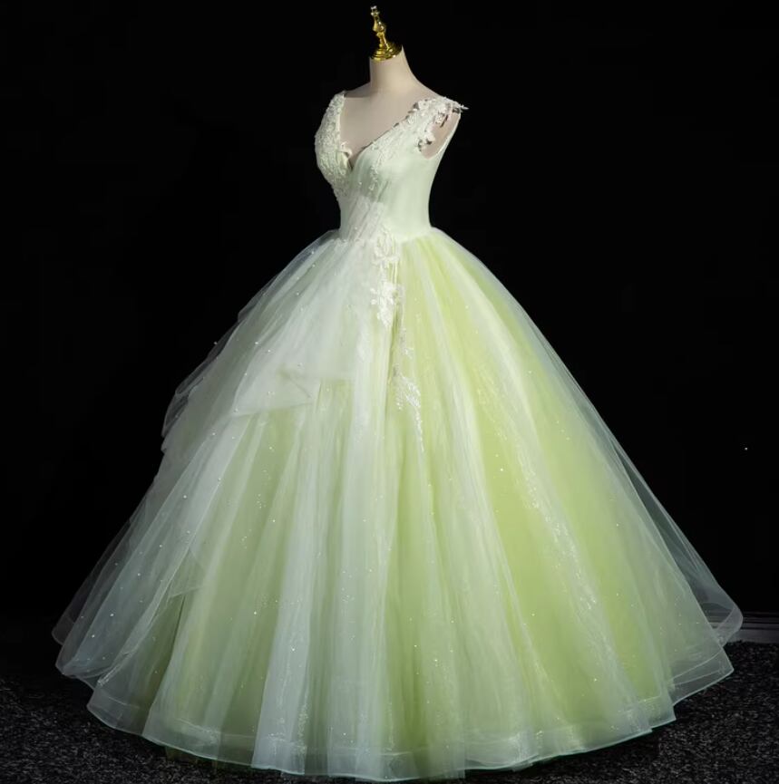 カラードレス ライトグリーン Vネック ノースリーブ パール 繊細レース プリンセスライン ラッフルフリル 花嫁