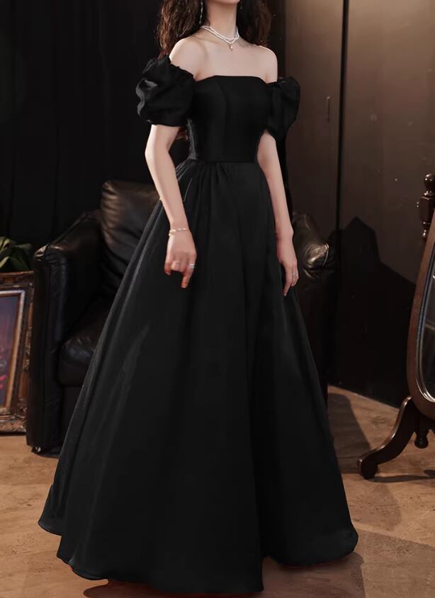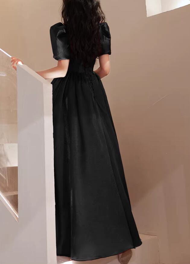 上品!パーティードレス ブラック スクエアネック パフスリーブ ロング スレンダーライン 2次会