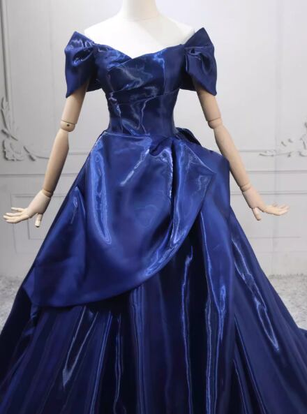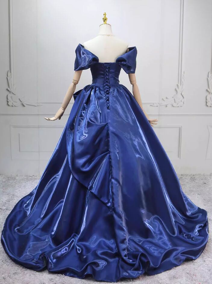 カラードレス ネイビー オフショルダー 光沢感 ラッフルフリル プリンセスライン 編み上げ 披露宴