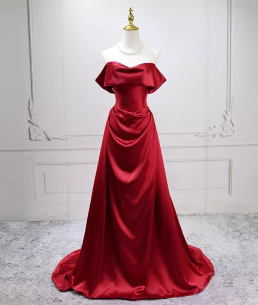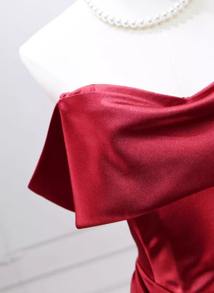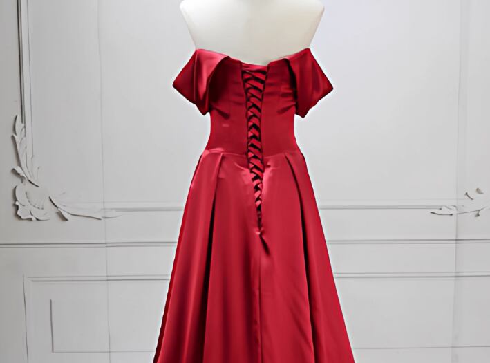カラードレス ボルドー色 オフショルダー 光沢サテン 優雅なシルエット 編み上げ 大人っぽい 披露宴