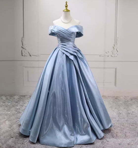 上品!カラードレス ブルー オフショルダー ハンドドレープ パール クラシカル 編み上げ 披露宴