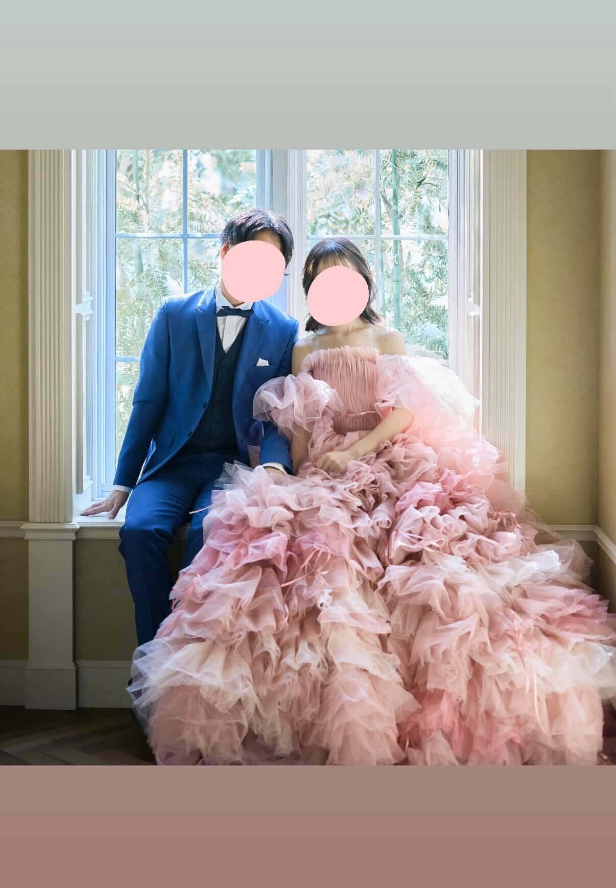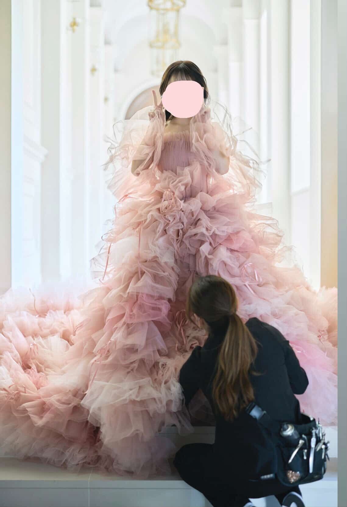 実例写真!カラードレス ピンク ベアトップ ふわふわ袖 グラデーション ボリュームドレス 憧れのドレス 花嫁