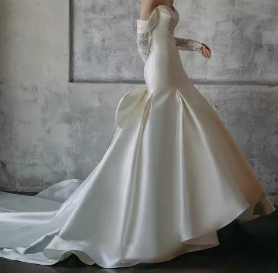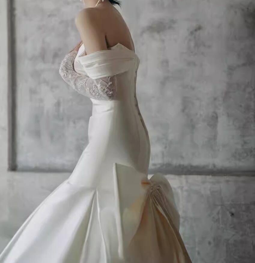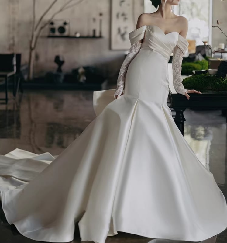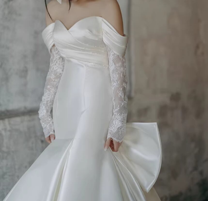 ウェディングドレス オフショルダー 上品透け袖 繊細レース パール 豪華なバックリボン 優雅なシルエット
