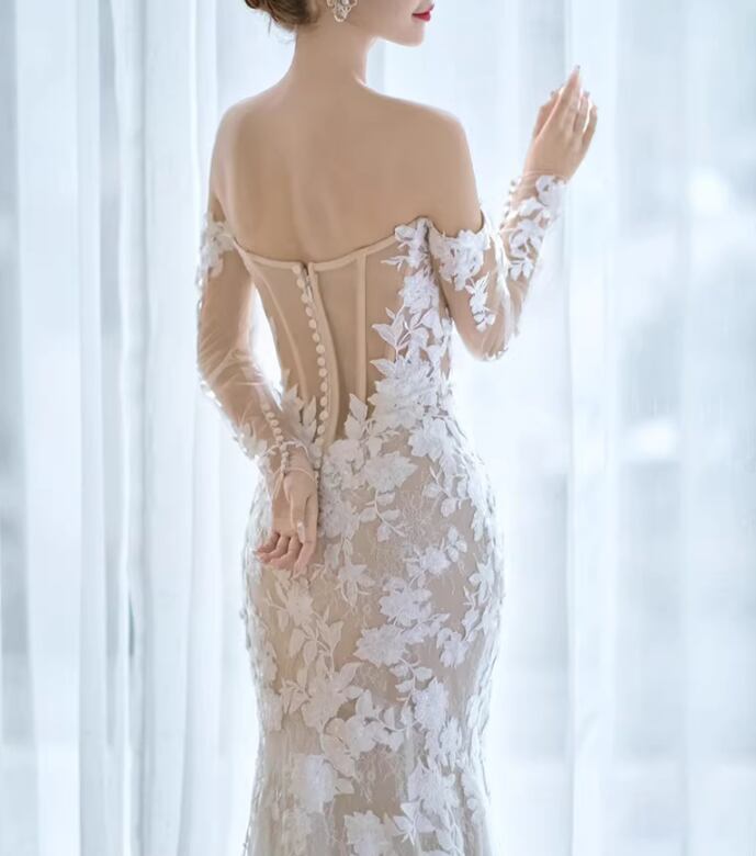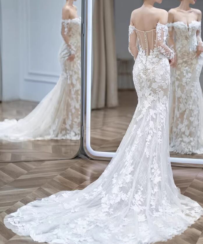 ウェディングドレス オフショルダー シースルー袖 贅沢な小花総レース マーメイドライン くるみボタン 拳式/前撮り