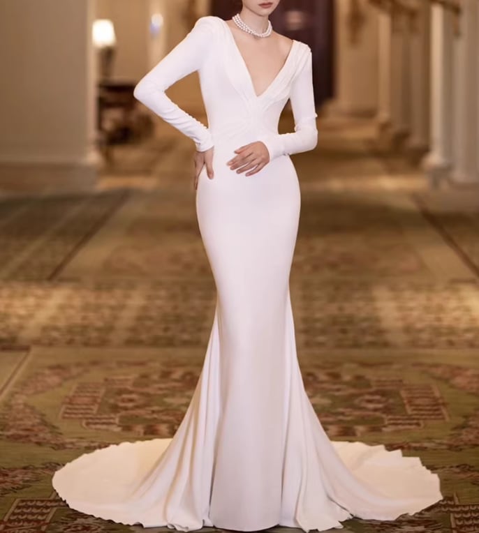 ウェディングドレス Vネック 背中見せ マーメイドライン 長袖 ロングトレーン ファスナー 披露宴