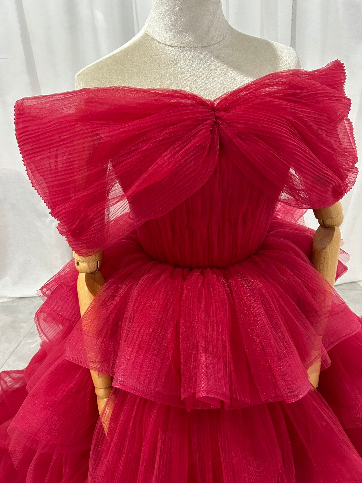 カラードレス ワインレッド 取り外しオフショルダー プリーツスカート ボリュームドレス クラシカル 花嫁