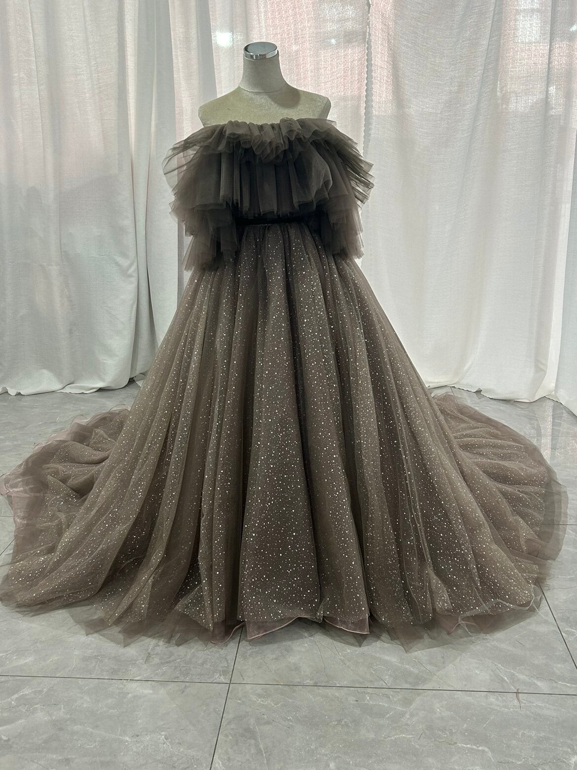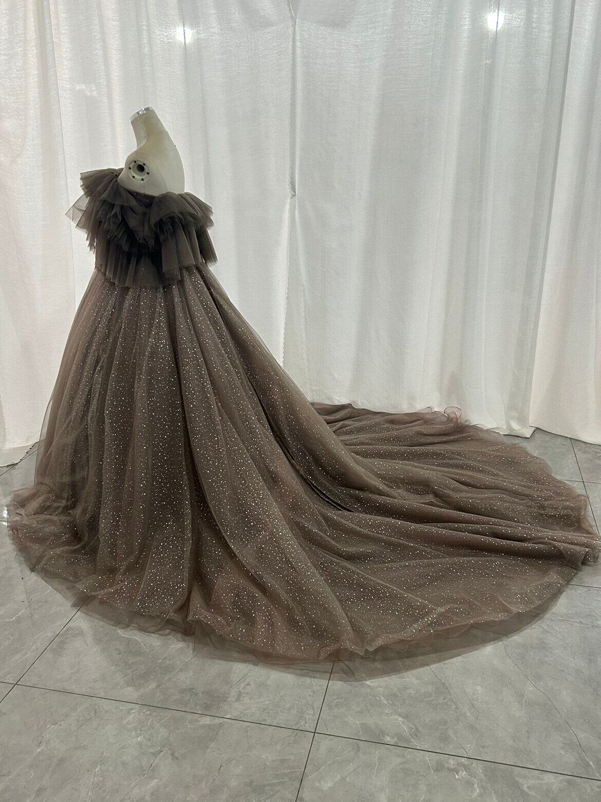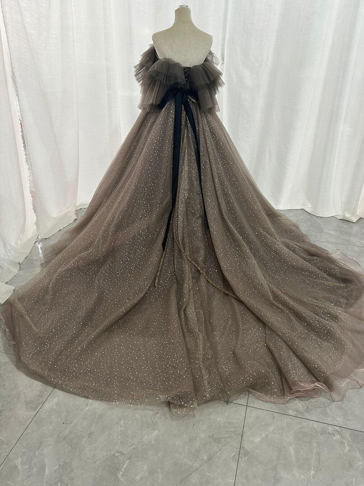 カラードレス カーキ色 オフショルダー サッシュベルト キラキラチュール クラシカル 前撮り