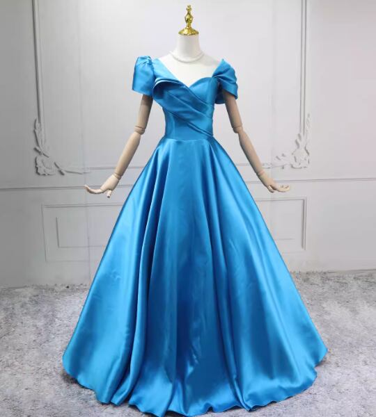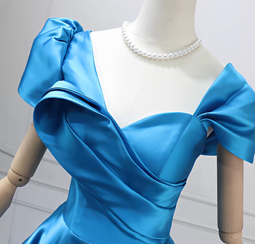 上品!カラードレス ブルー 光沢サテン パフスリーブ ハンドドレープ Aライン エレガント 演奏会