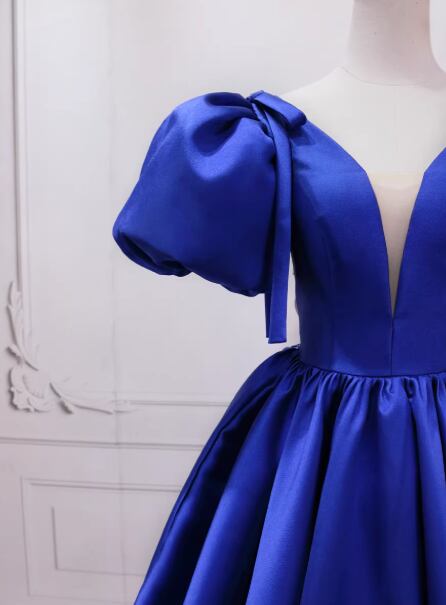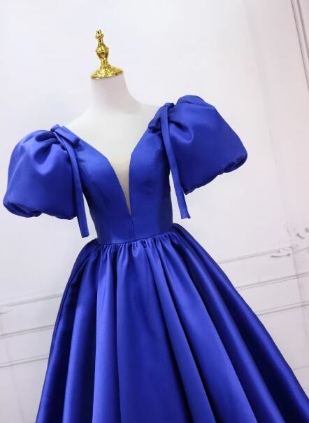 カラードレス ジュエルブルー Vネック パフスリーブ ロング 揺らめく裾 編み上げ 披露宴
