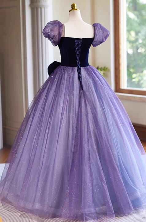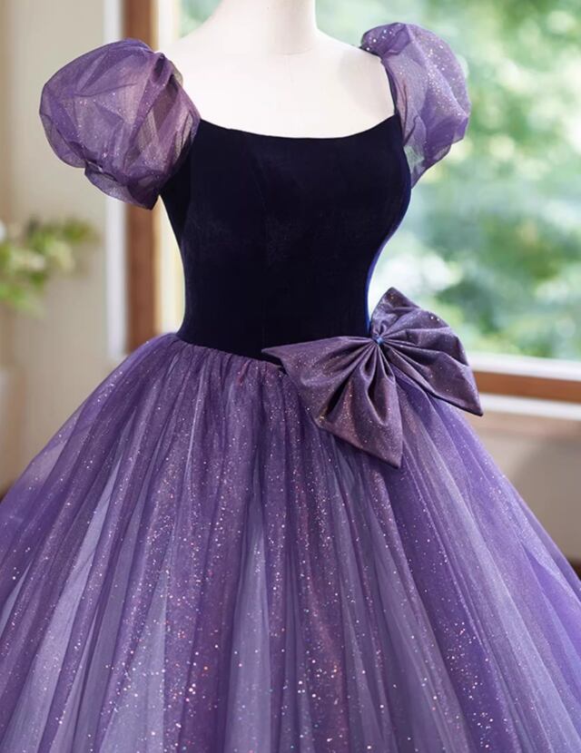 カラードレス パープル パフスリーブ ビロード キラキラチュール ふわふわドレス 編み上げ 演奏会