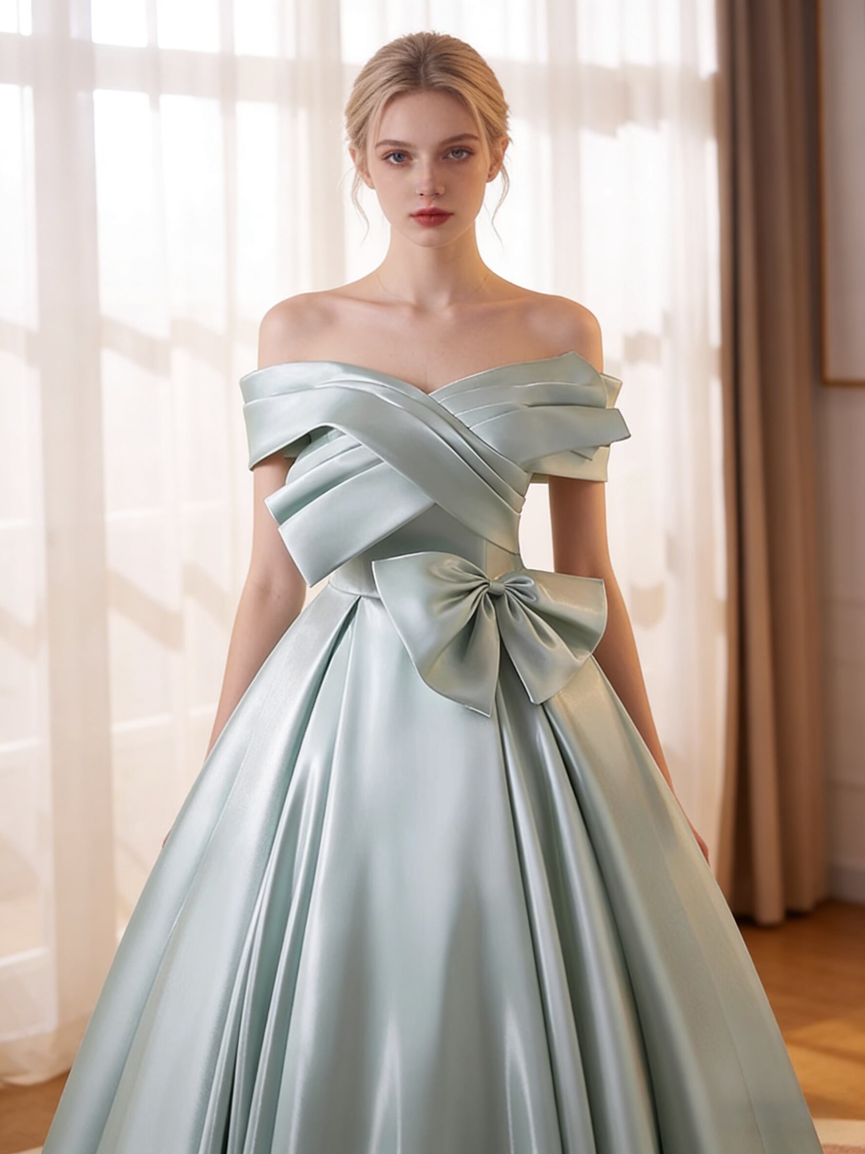 カラードレス ライトブルー オフショルダー 光沢サテン ハンドドレープ リボン ロング フレアスカート 音楽会