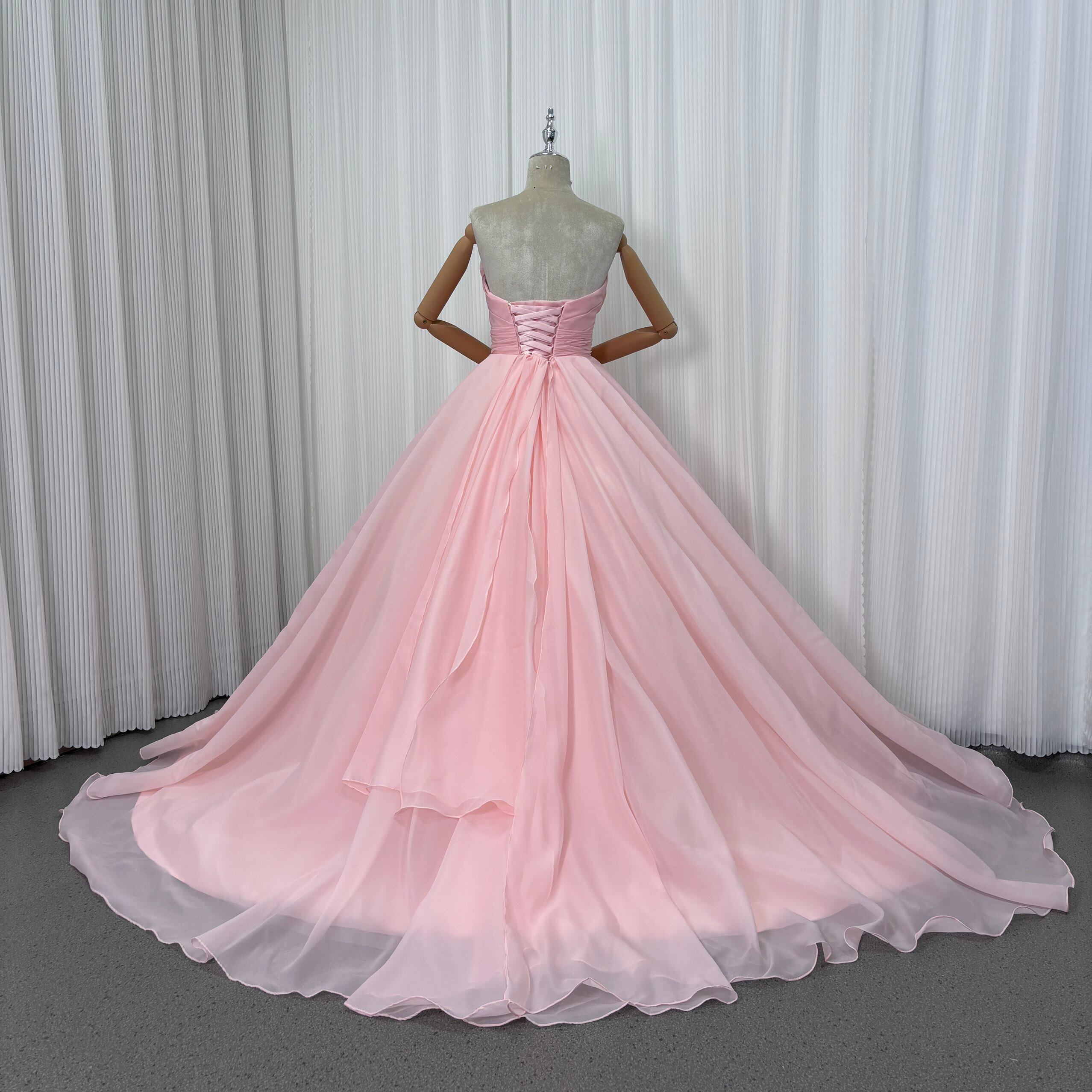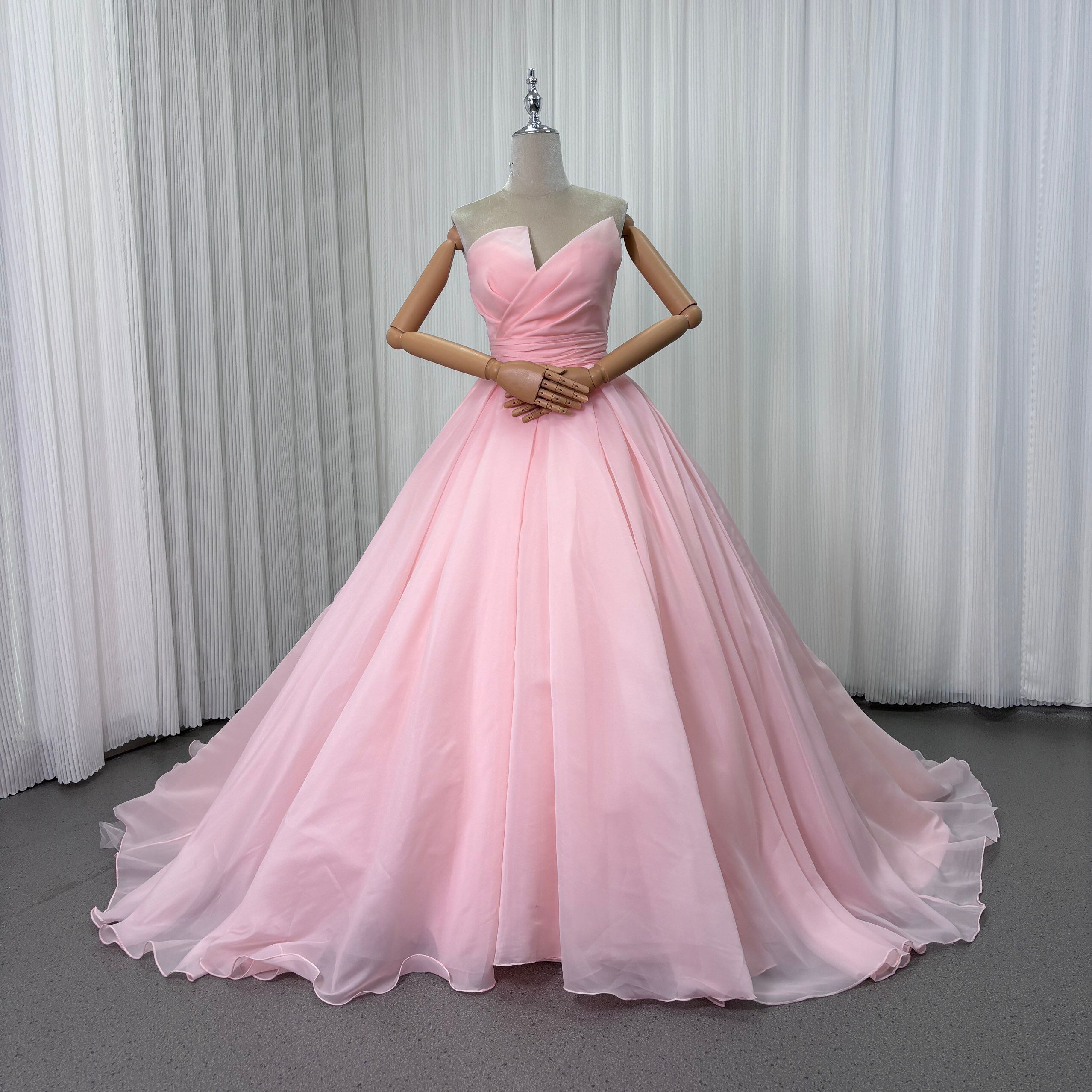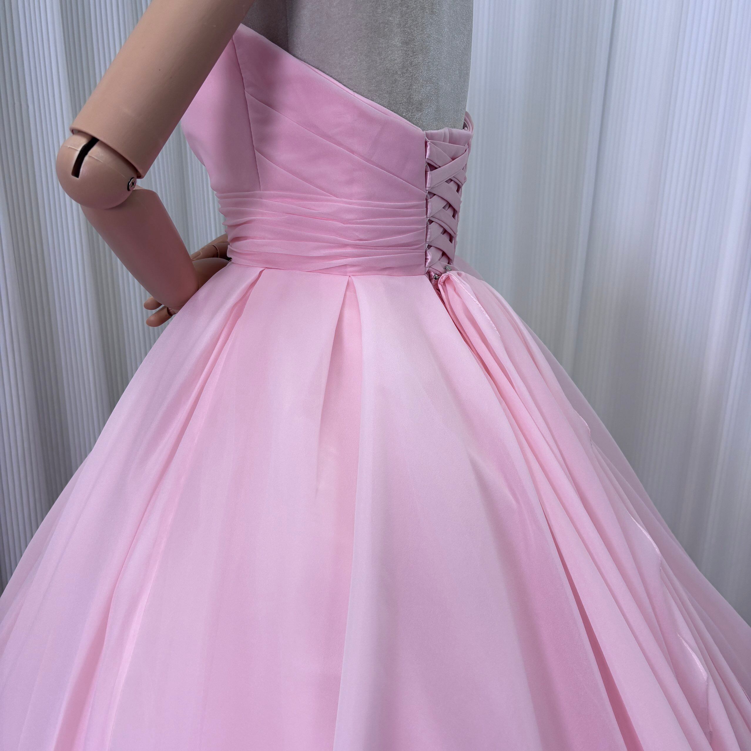 フランス風 カラードレス ピンク ベアトップ デザイン感 フレアスカート ソフトオーガンジー 花嫁