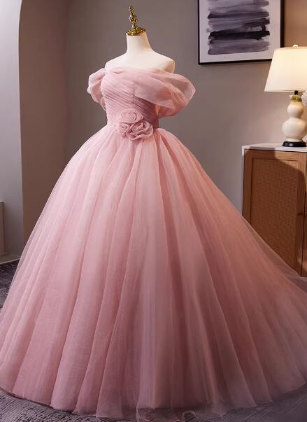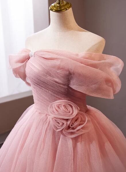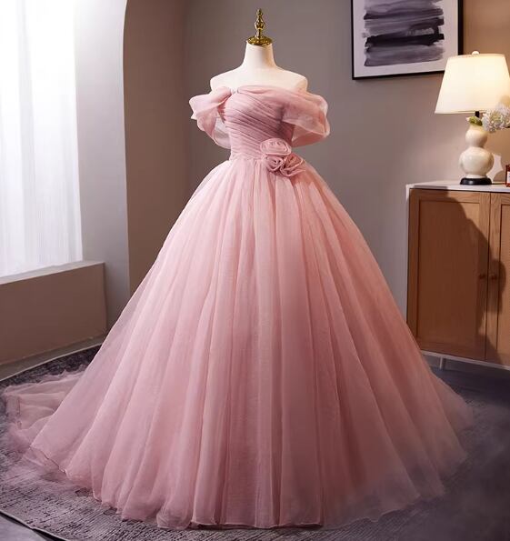 上品!カラードレス ピンク オフショルダー バラトレーン プリンセスライン 編み上げ 披露宴 花嫁