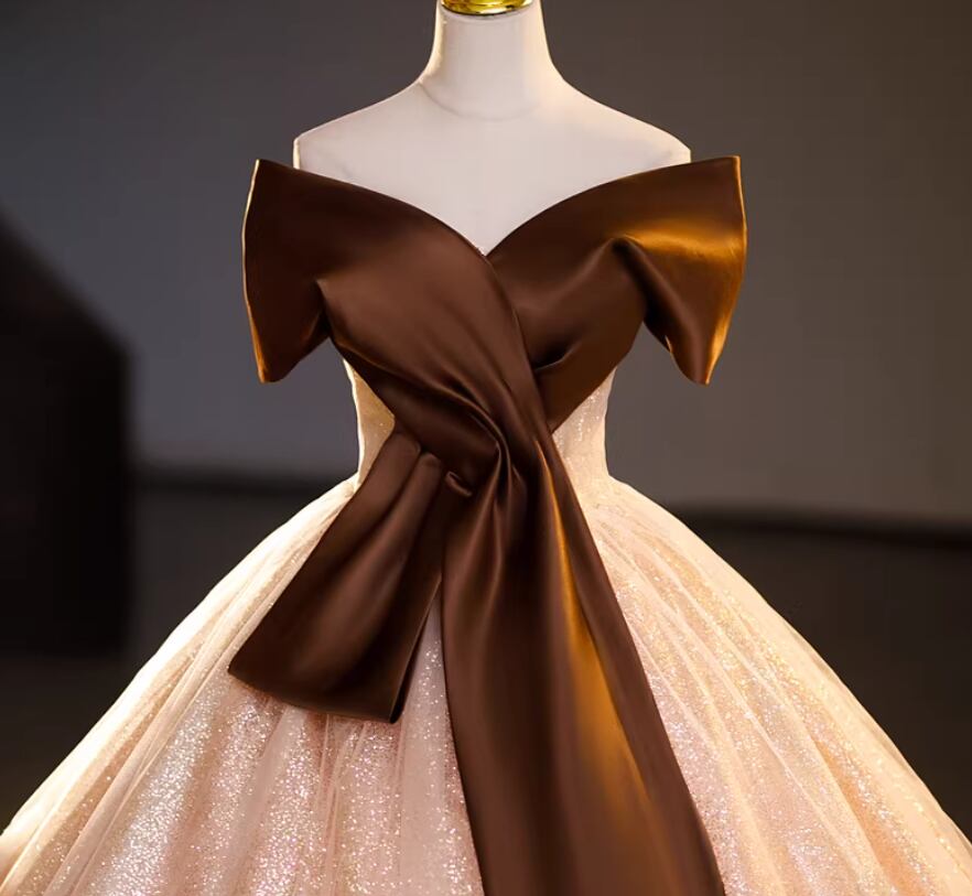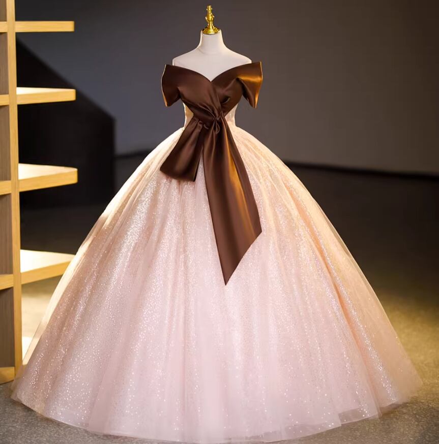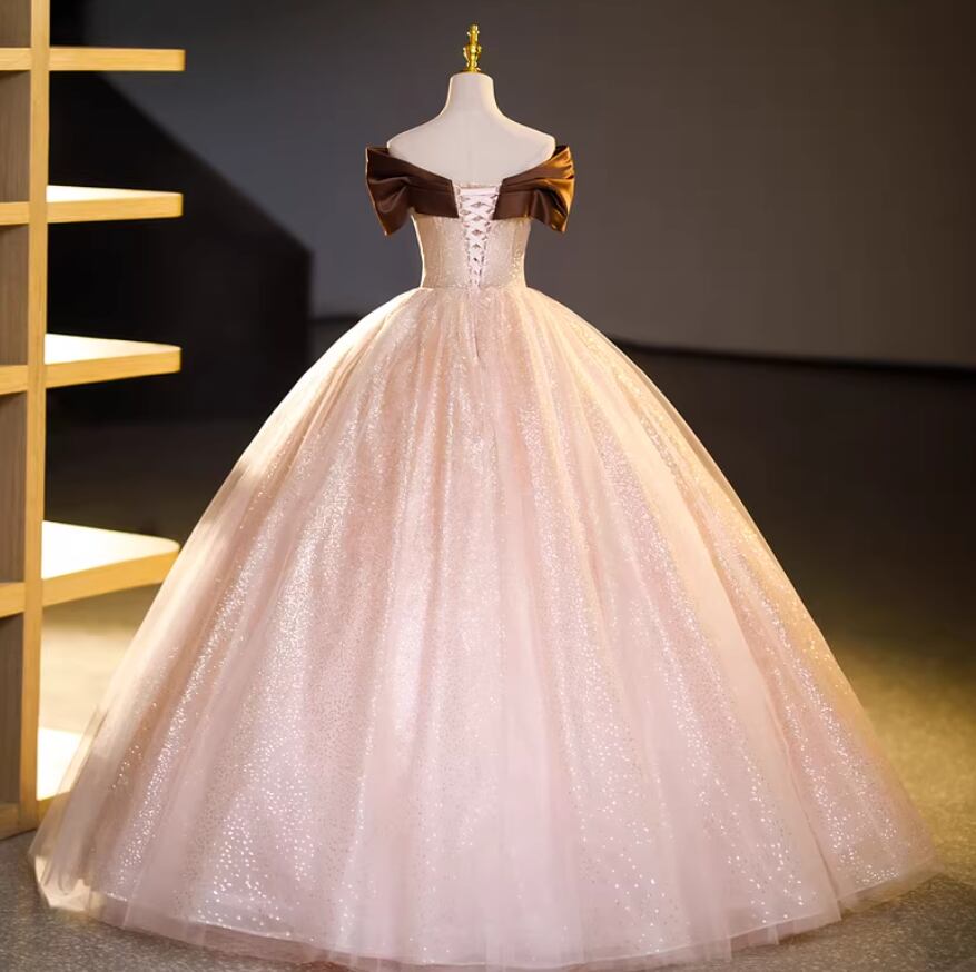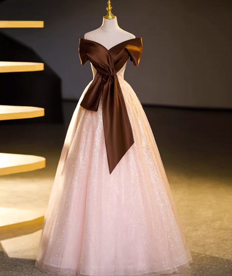 カラードレス ブラウン オフショルダー 薄ピンク キラキラチュール フレアスカート ロング 演奏会/音楽会