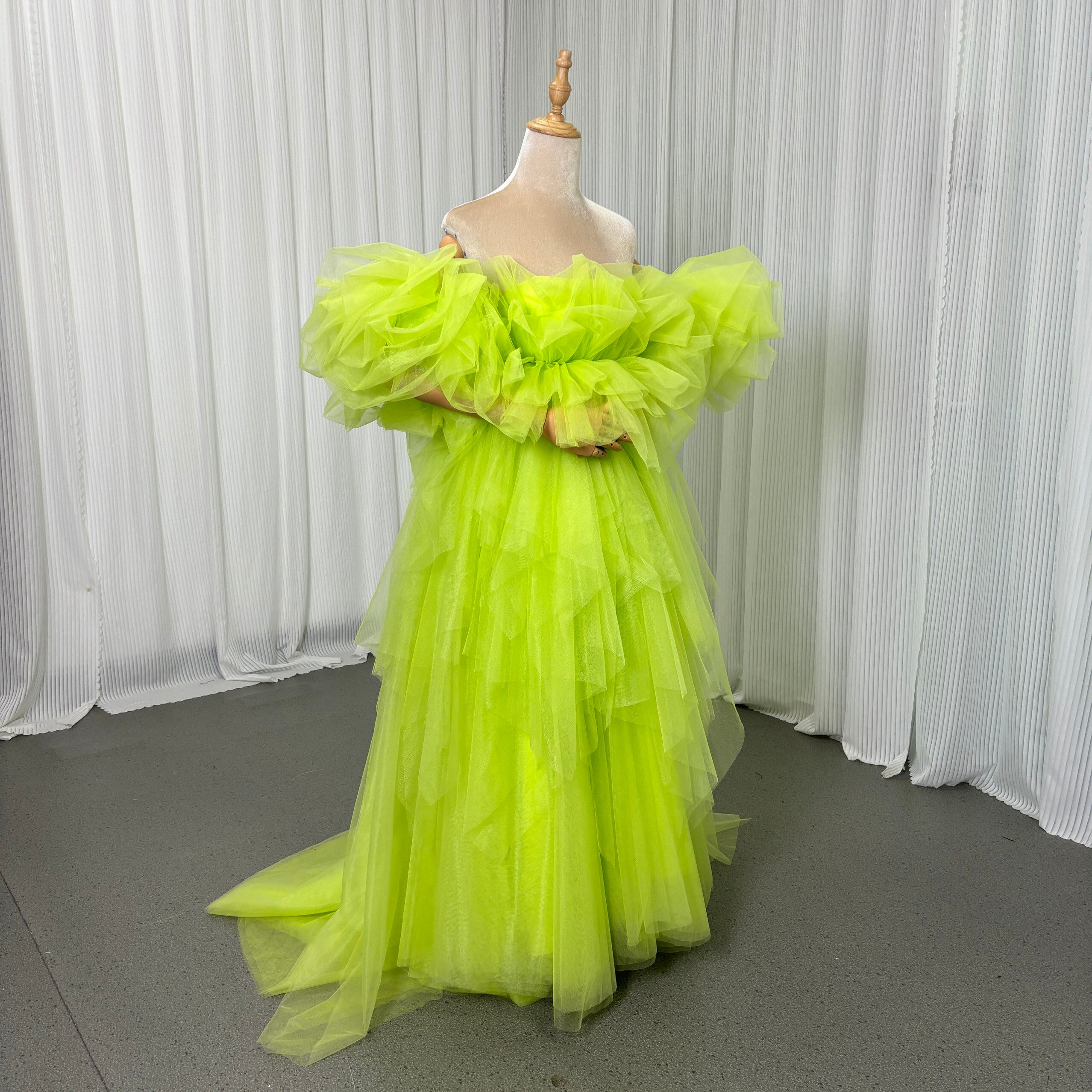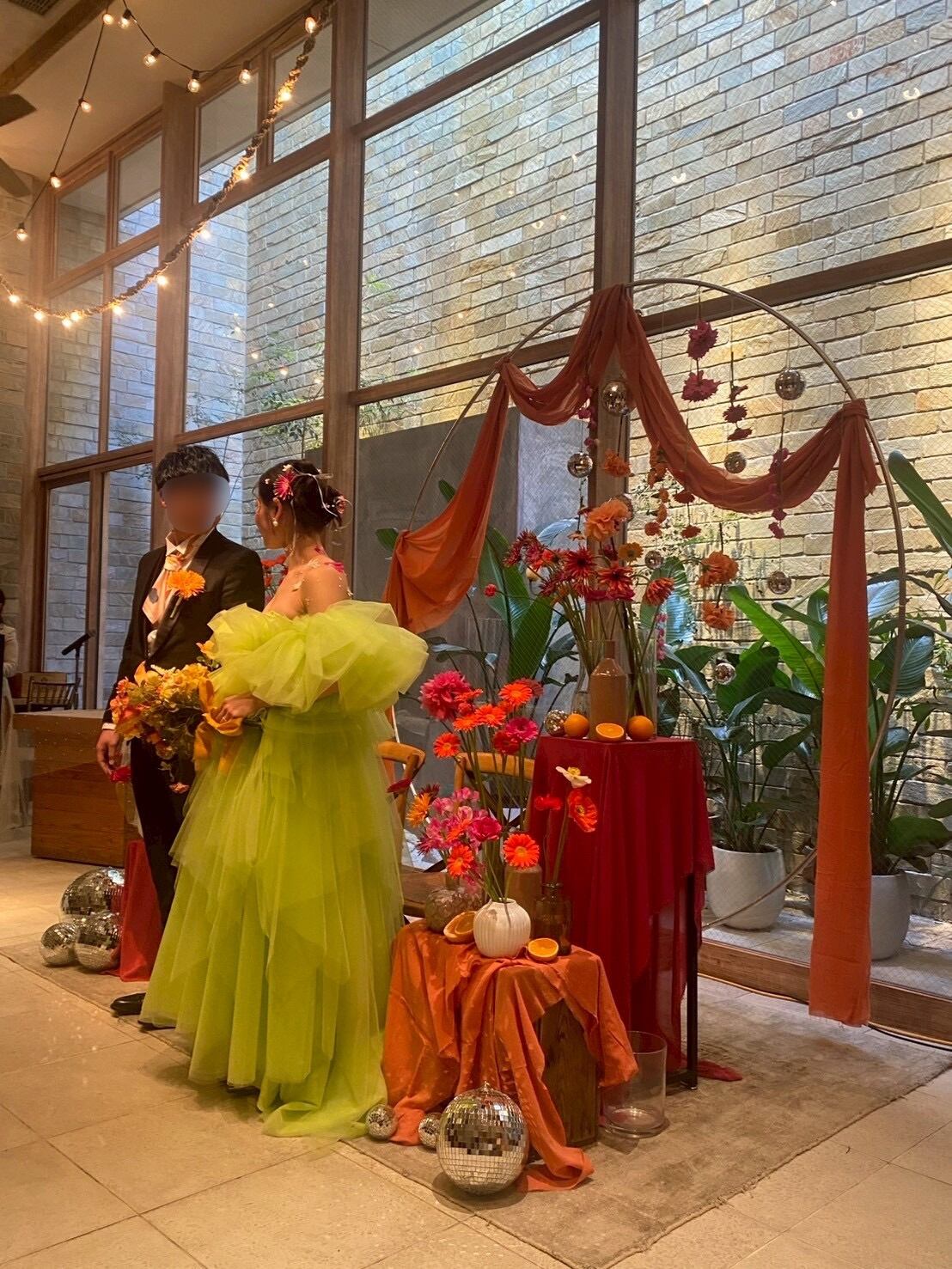 実例写真!カラードレス ミントグリーン 取り外し袖 ラッフルフリル ミニトレーン ソフトチュール 花嫁