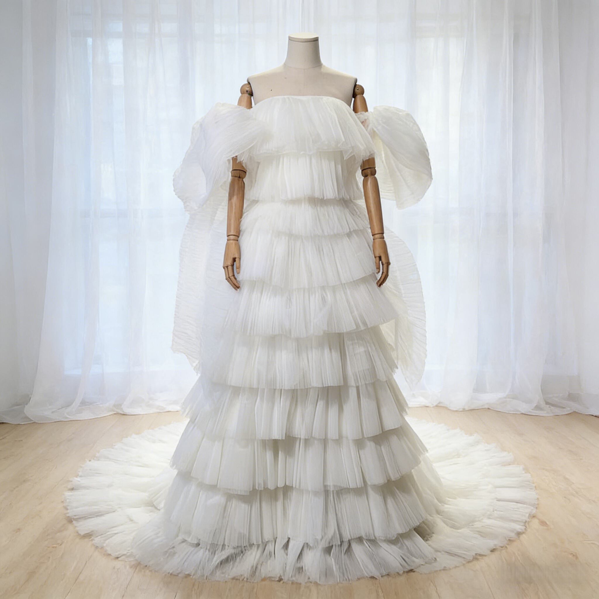 ウェディングドレス ベアトップ ふっくら柔らかなリボン姫袖 プリーツスカート ボリュームドレス 前撮り