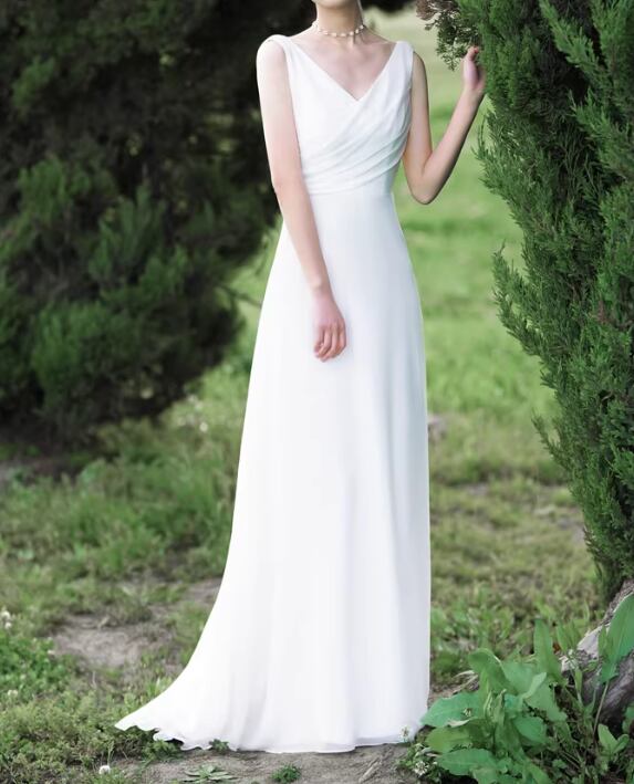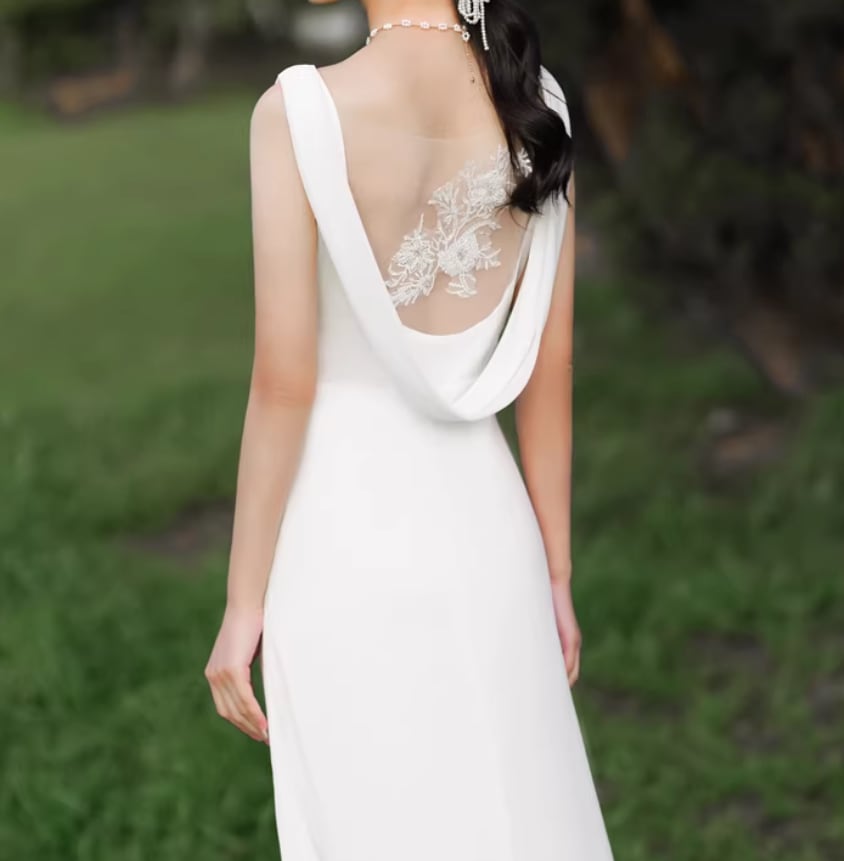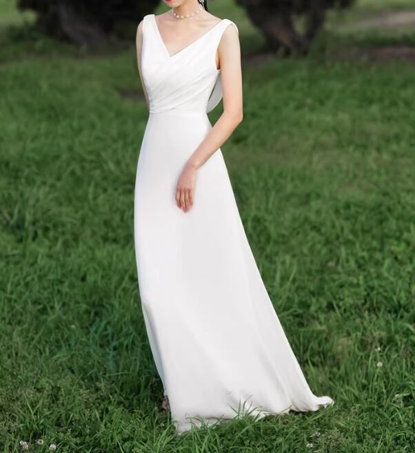 ウエディングドレス Vネック 背中見せ 美しいバックレース ミニトレーン スレンダーライン 前撮り