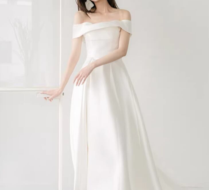 エレガント ウェディングドレス オフショルダー フロントスリット ミカドサテン 細見えシルエット 結婚式