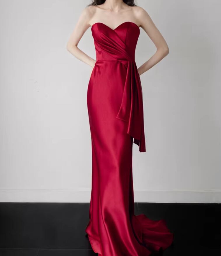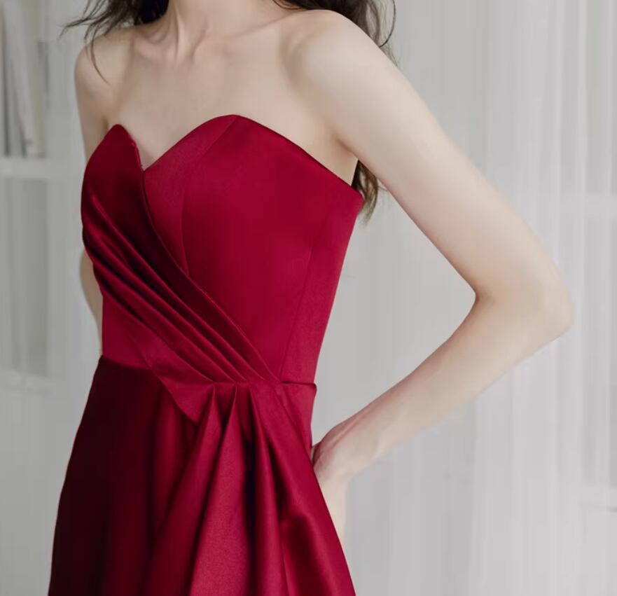 カラードレス ボルドー色 ベアトップ ハンドドレープ マーメイドライン ミニトレーン 謝恩会