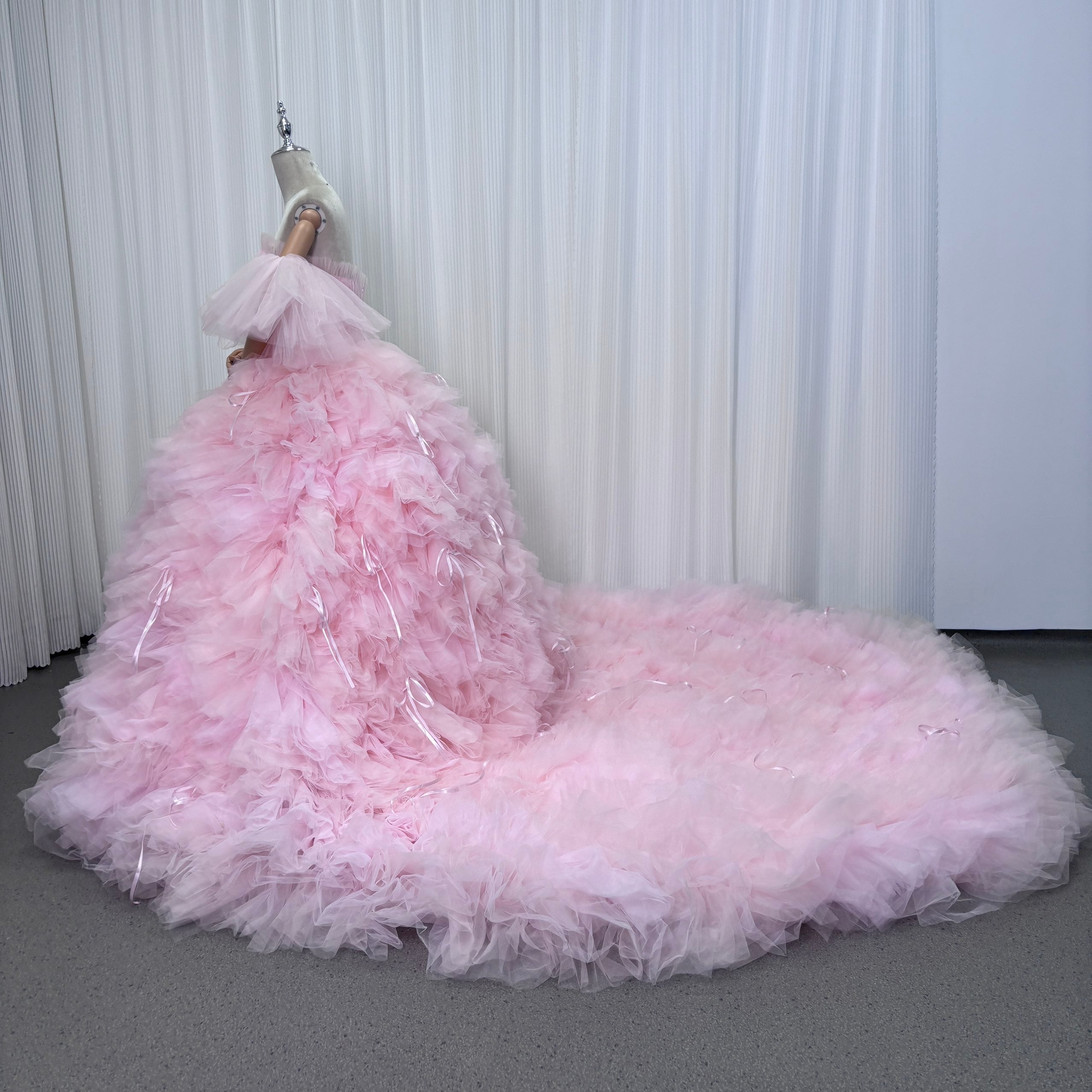 豪華!カラードレス ピンク ベアトップ ふわふわ袖 グラデーション 柔らかく重ねたチュールスカート リボン 花嫁 前撮り