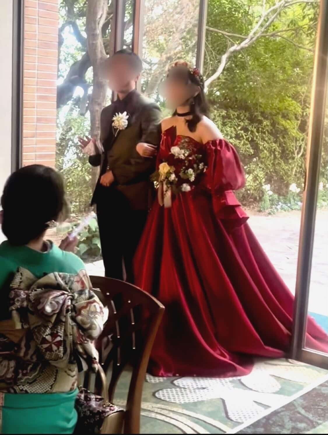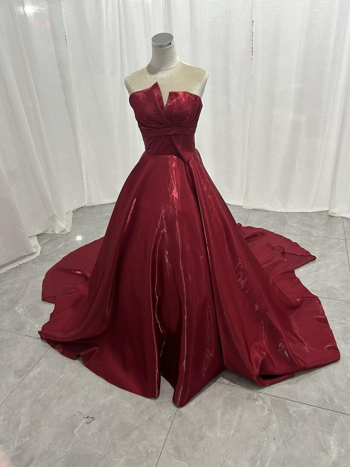 実例写真!カラードレス 赤 ベアトップ パフスリーブ ふっくら柔らかなバックリボン 光沢サテン 花嫁/前撮り