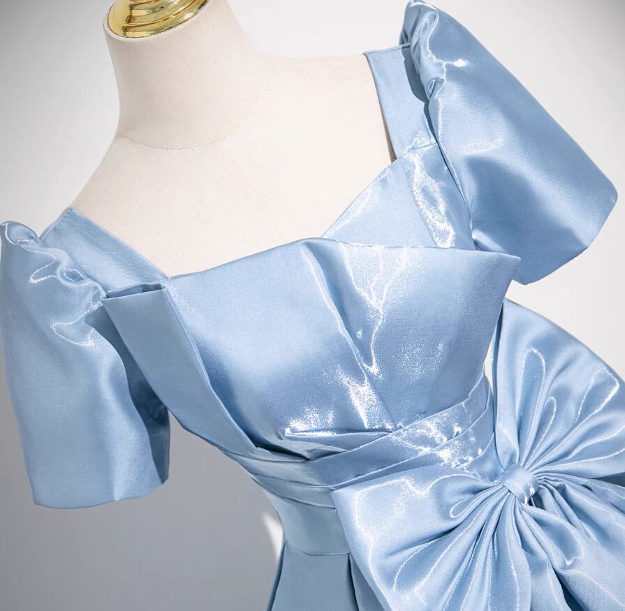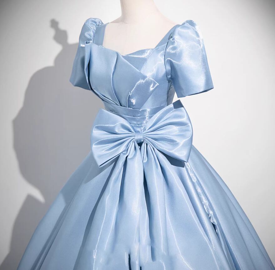 カラードレス ブルー 光沢サテン スクエアネック パフスリーブ 豪華なリボン フレアスカート 演奏会/音楽会