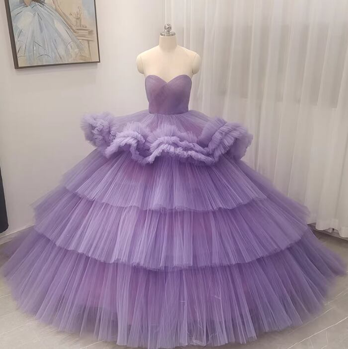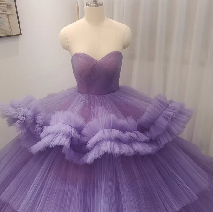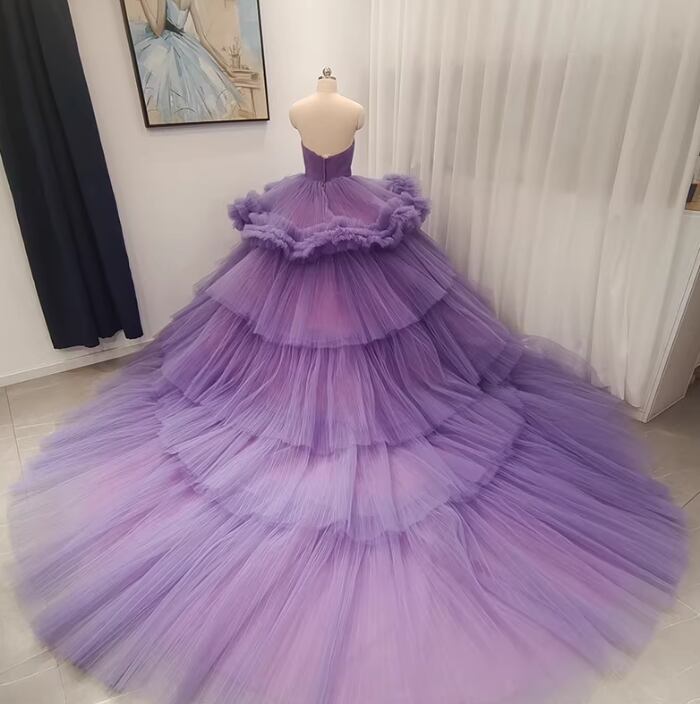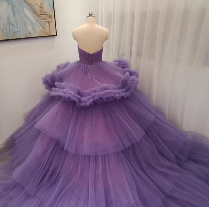 カラードレス パープル ベアトップ ラッフルフリル ボリュームドレス ロングトレーン プリーツスカート 前撮り