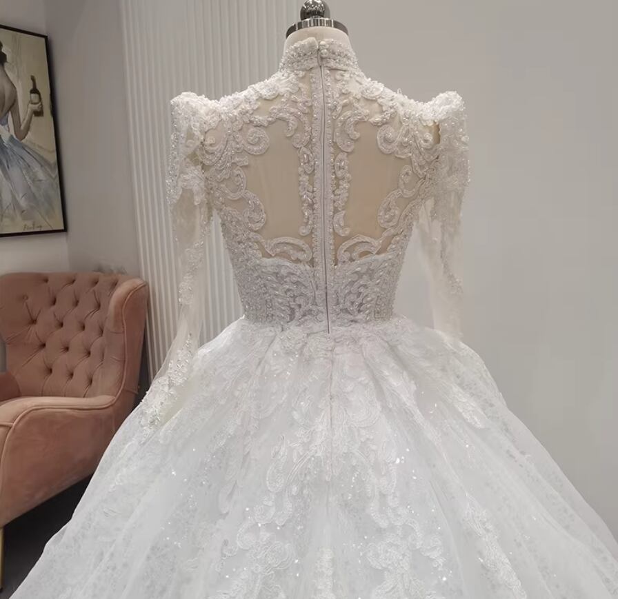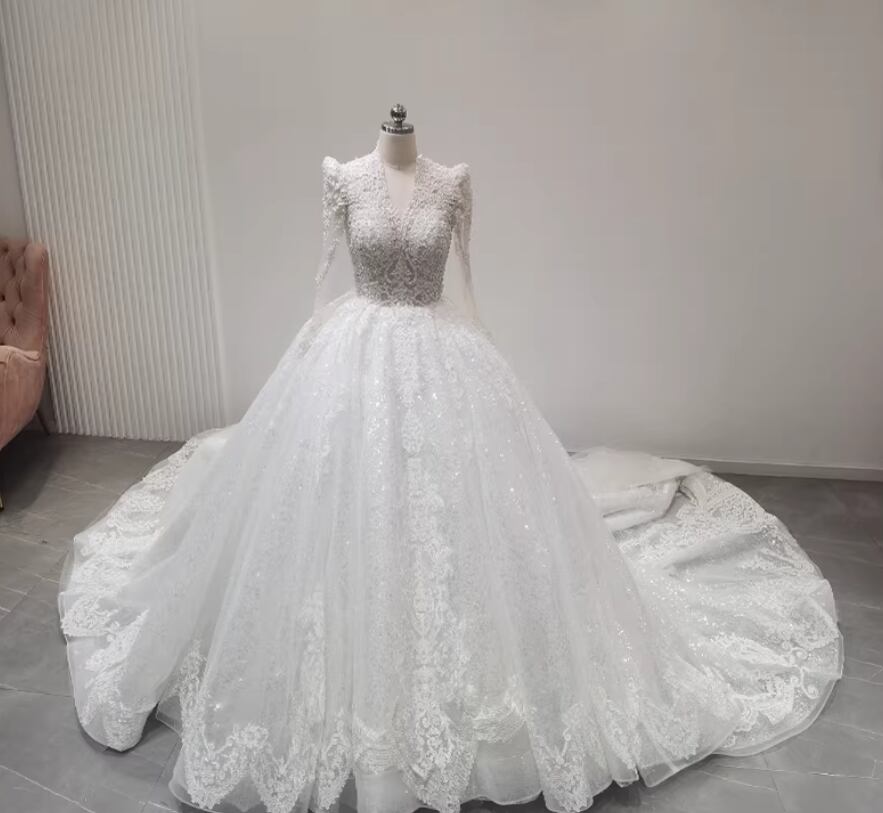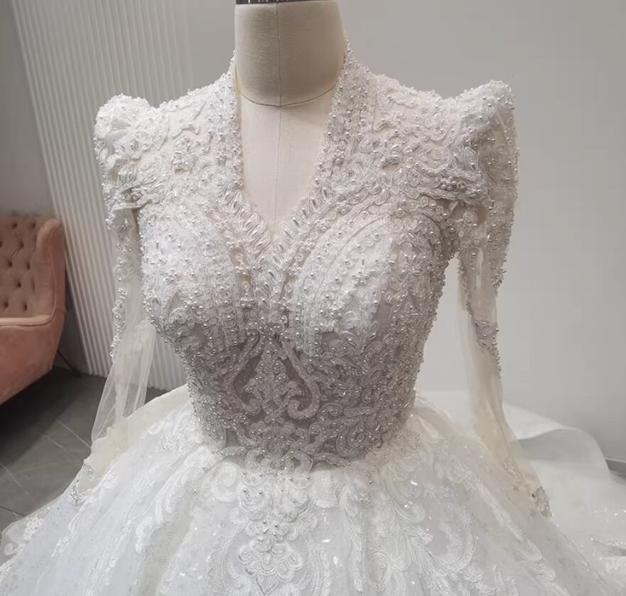 豪華!ウェディングドレス Vネック 長袖 韓国風ドレス エレガントレース パール 華やかなトレーン 結婚式
