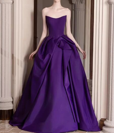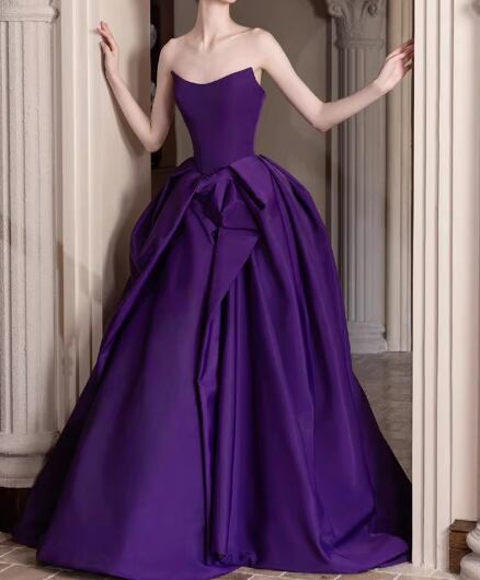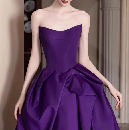 カラードレス パープル ベアトップ 光沢サテン ラッフルフリル ミニトレーン 大人っぽい 披露宴