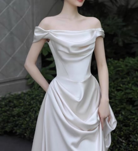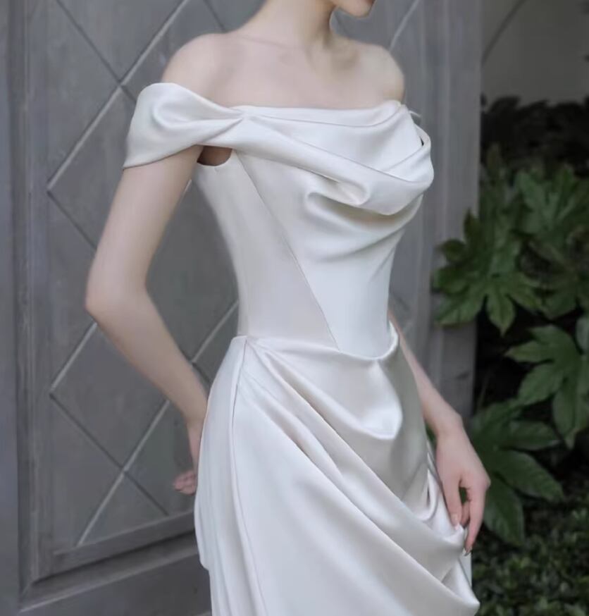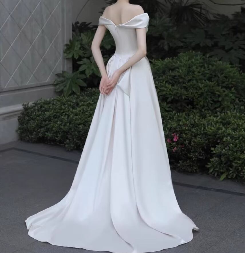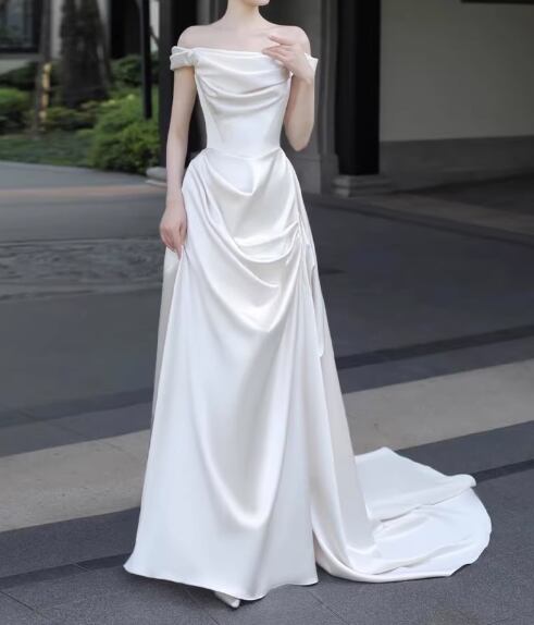 ウェディングドレス オフショルダー 優雅なシルエット 光沢サテン ミニトレーン セクシー 結婚式