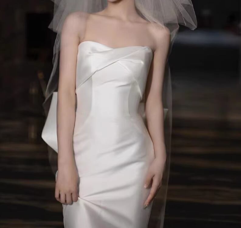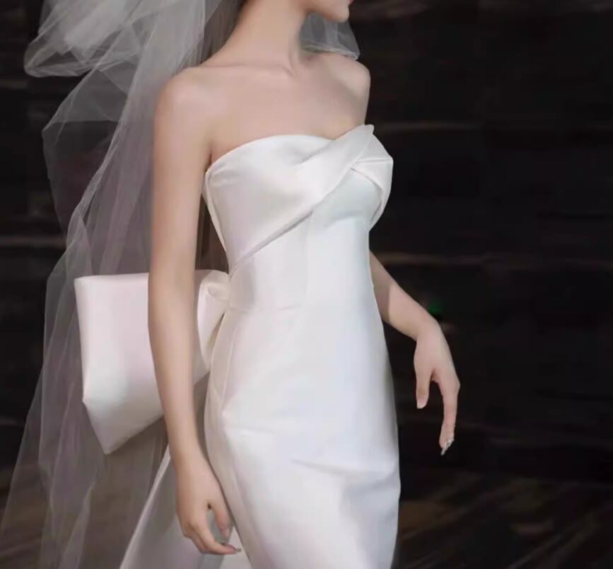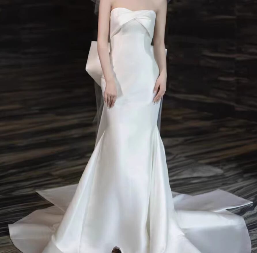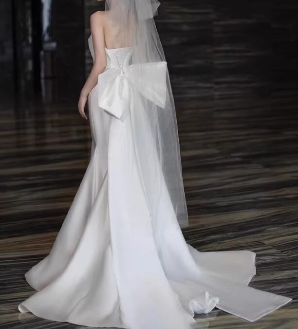 ウェディングドレス ベアトップ マーメイドライン 豪華なバックリボン ハンドドレープ 結婚式