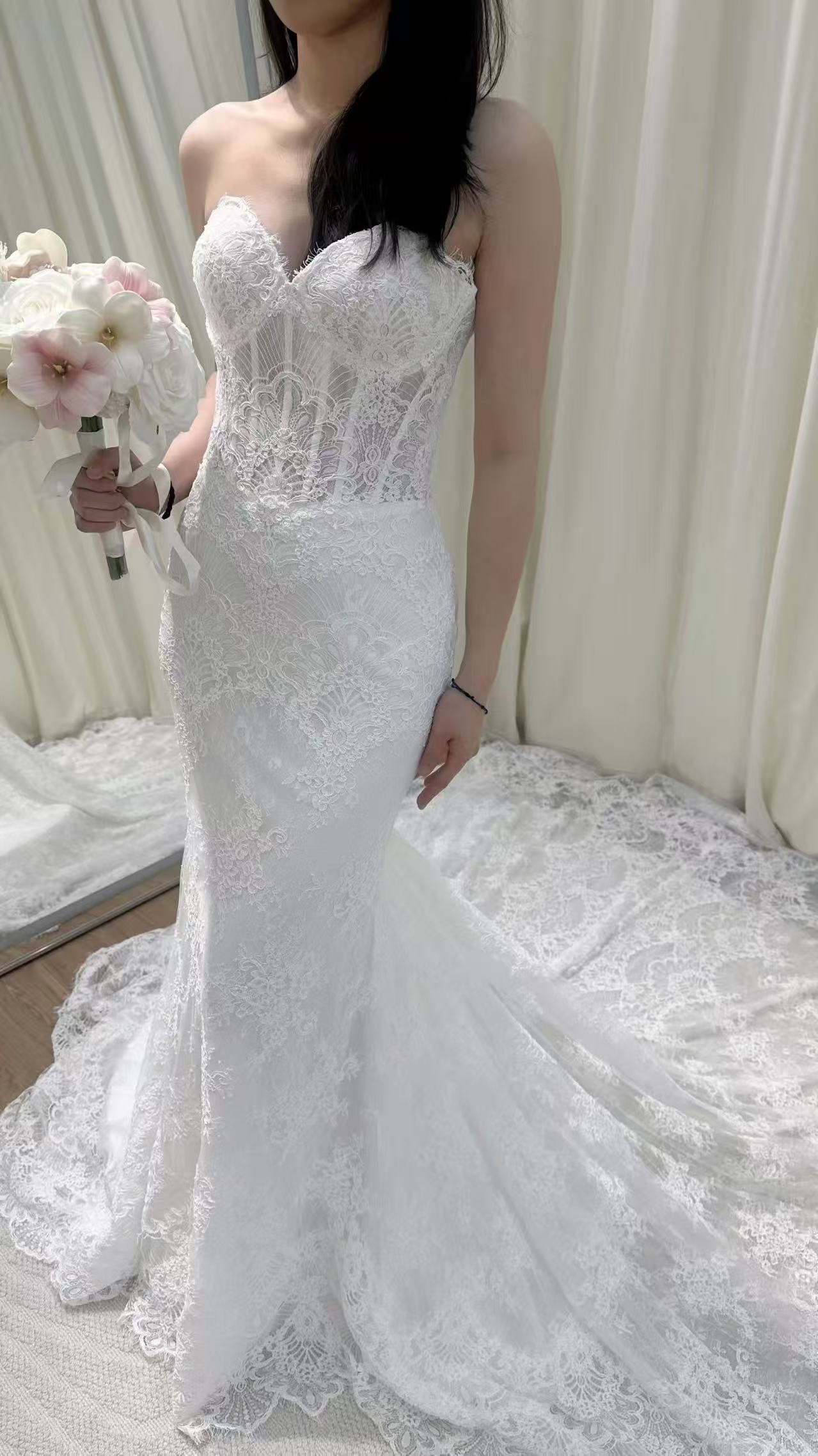 美品!ウェディングドレス ベアトップ マーメイドライン 贅沢な小花総レース 華やかなトレーン 結婚式