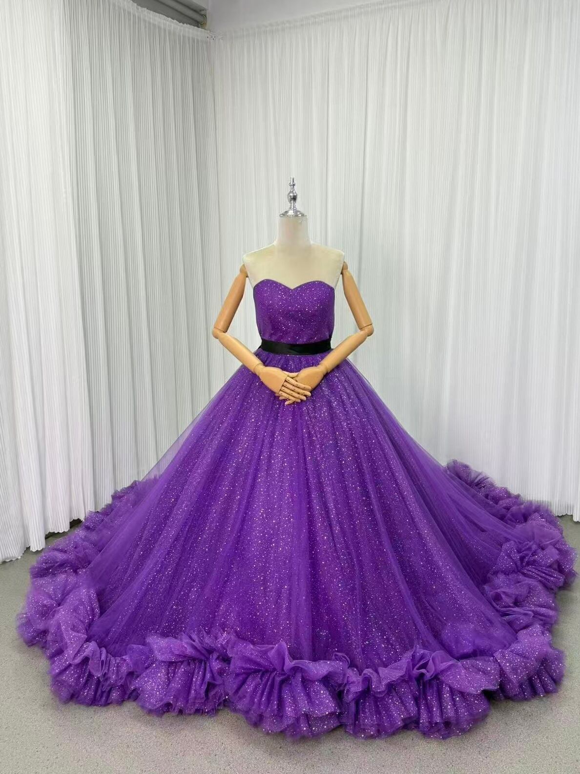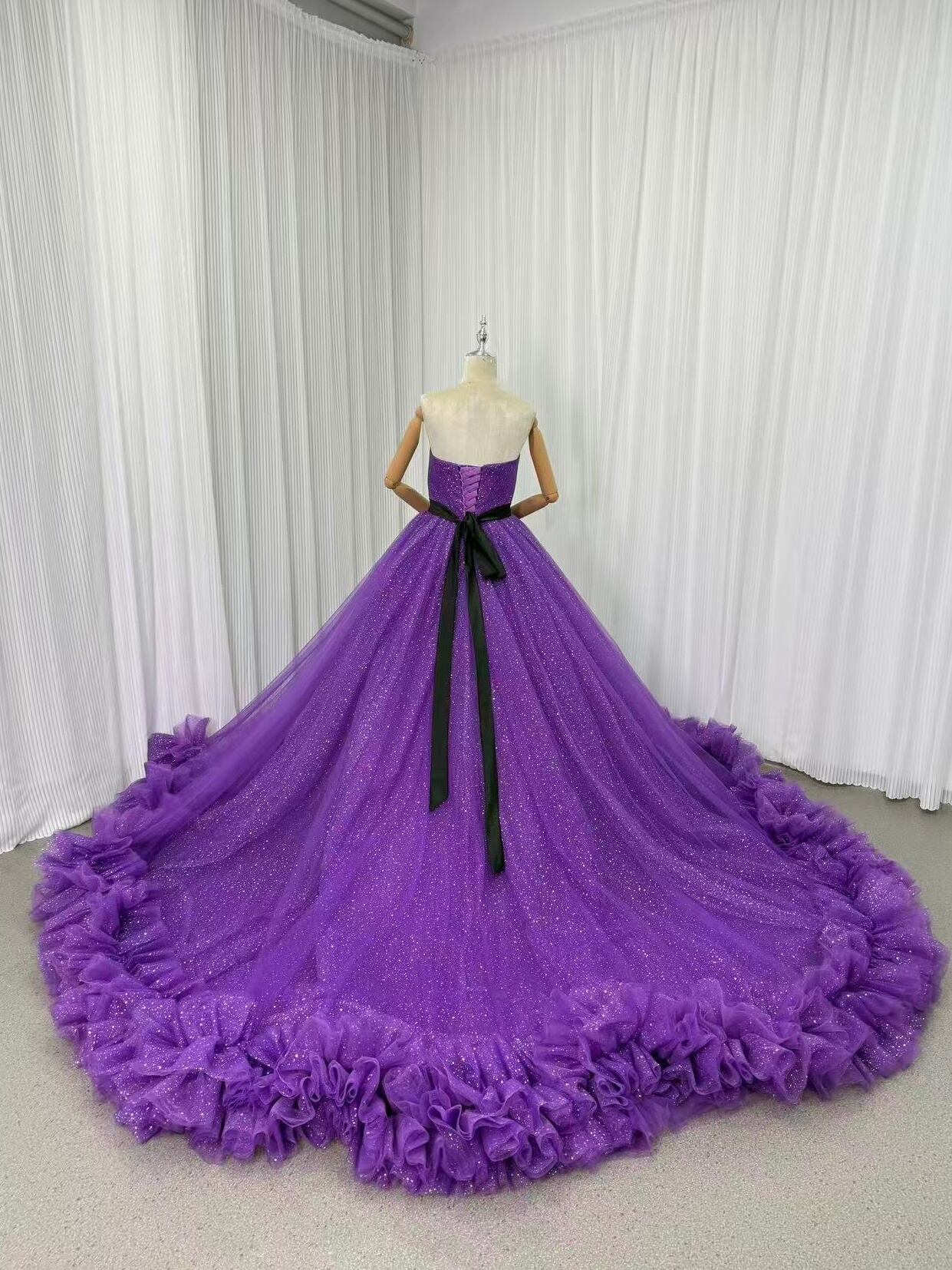 カラードレス パープル ベアトップ シークインチュール ラッフルフリル ロングトレーン 披露宴