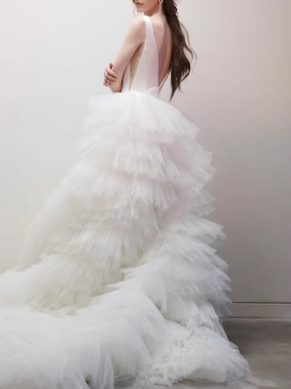 人気上昇!ウェディングドレス Vネック 背中見せ 柔らかく重ねたチュールスカート ボリュームドレス 結婚式