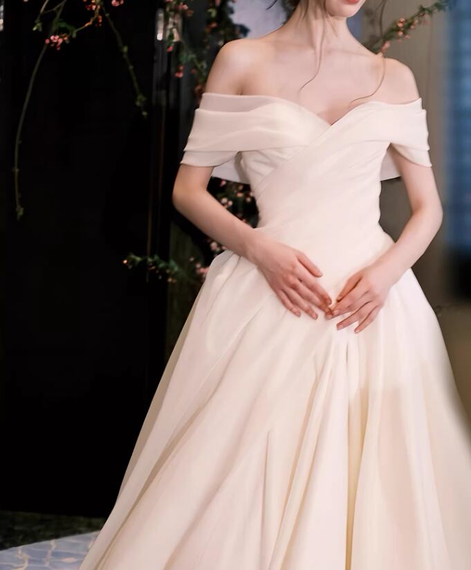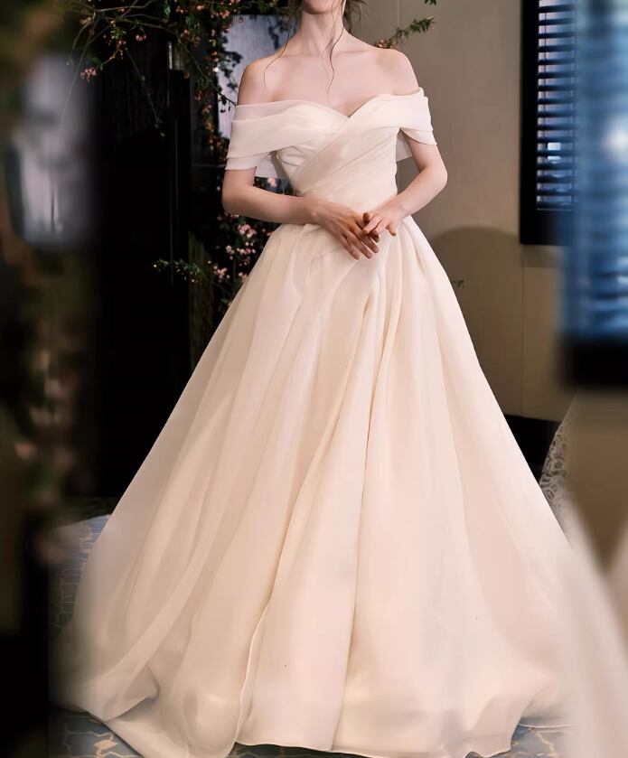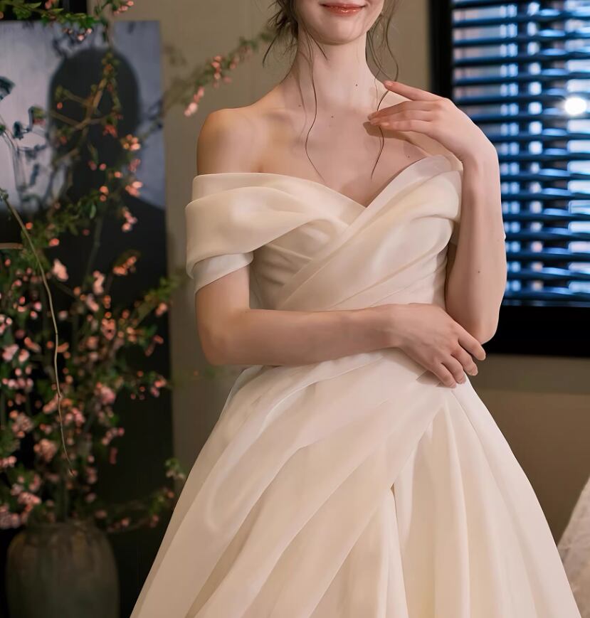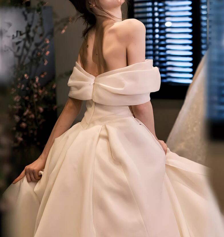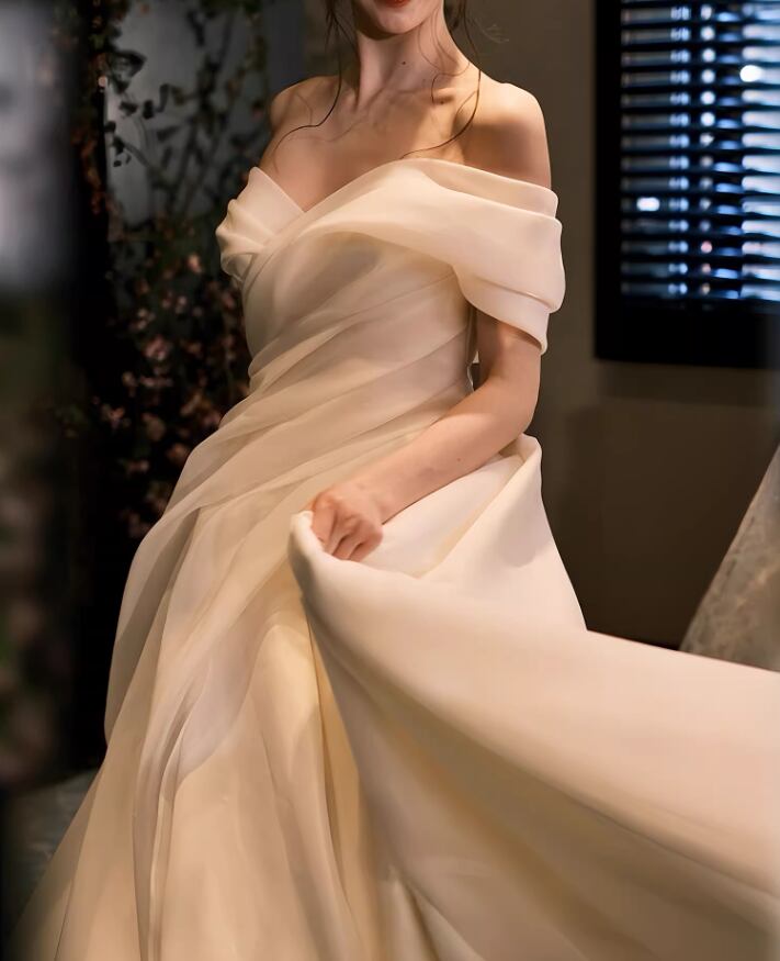 フランス風 ウェディングドレス 上質オーガンジー オフショルダー ハンドドレープ 揺らめく裾 ファスナー 結婚式