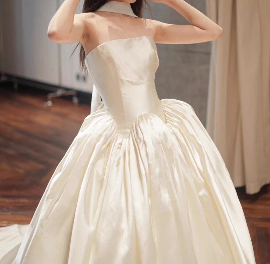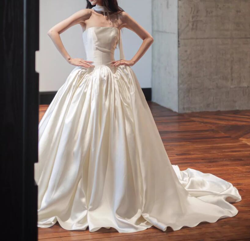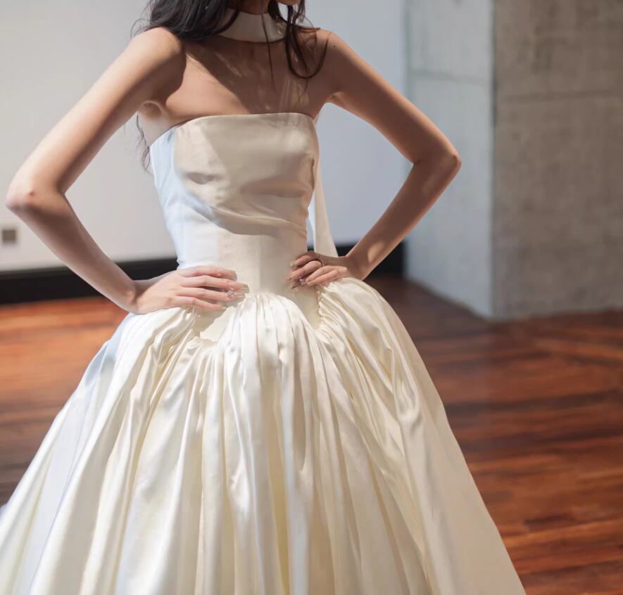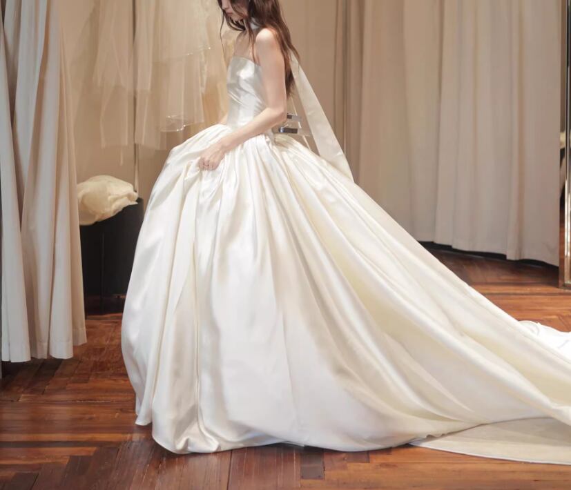 ウェディングドレス シルクタフタ ベアトップ フレアスカート ロングトレーン フランス風 結婚式